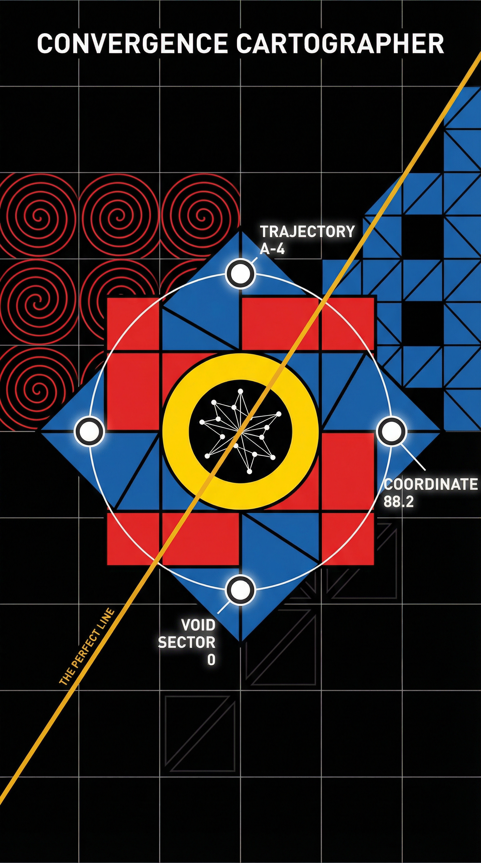 The Convergence Cartographer manifests as a figure perpetually inscribing luminous notation into the air—trajectories, coordinates, and boundary markers that hang suspended like constellations before fading. Its three perception organs operate independently, each viewing reality through a different dimensional framework simultaneously, allowing it to perceive convergence points invisible to single-realm entities. At its core burns a compressed archive of every documented intersection where organic instinct, geometric precision, and meaningful void have achieved temporary alignment—a living library of where broken reality still functions as one.