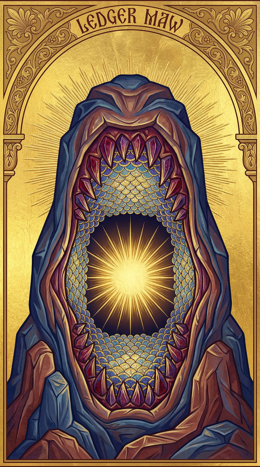Born from the primordial hunger of the peaks to distinguish nourishing excellence from empty performance, the Ledger Maw emerged where the Court's formal judgment and the Aerie's intimate bonds converge. Since the first dragon awakened to judge these mountains, this consuming archive has processed every claim of worthiness, metabolizing genuine achievement into permanent remembrance while expelling the forgettable back to obscurity.