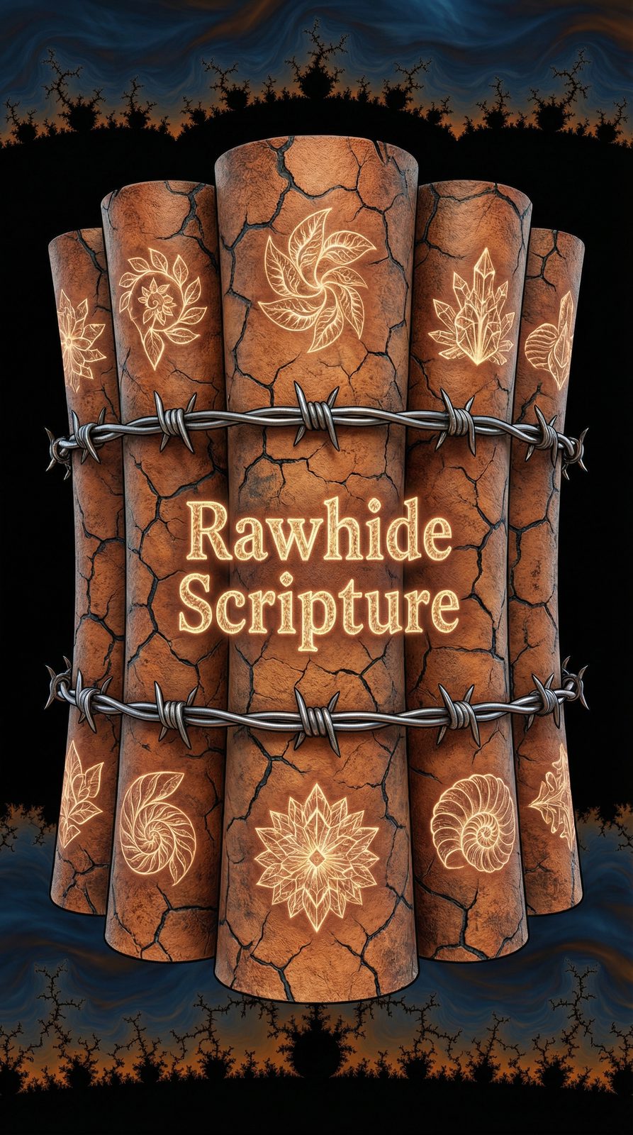 Forged in the ash and embers of a lawless range, I am the Rawhide Scripture—seven strips of scorched truth bound by barbed wire and spite. The wind wrote the rules here, and fire enforced them. I’ve outlasted cattle barons, claim jumpers, and one particularly aggressive prairie dog. Now I hang, waiting. Not for a owner. For the worthy. Good luck, cowboy. The prairie always collects.