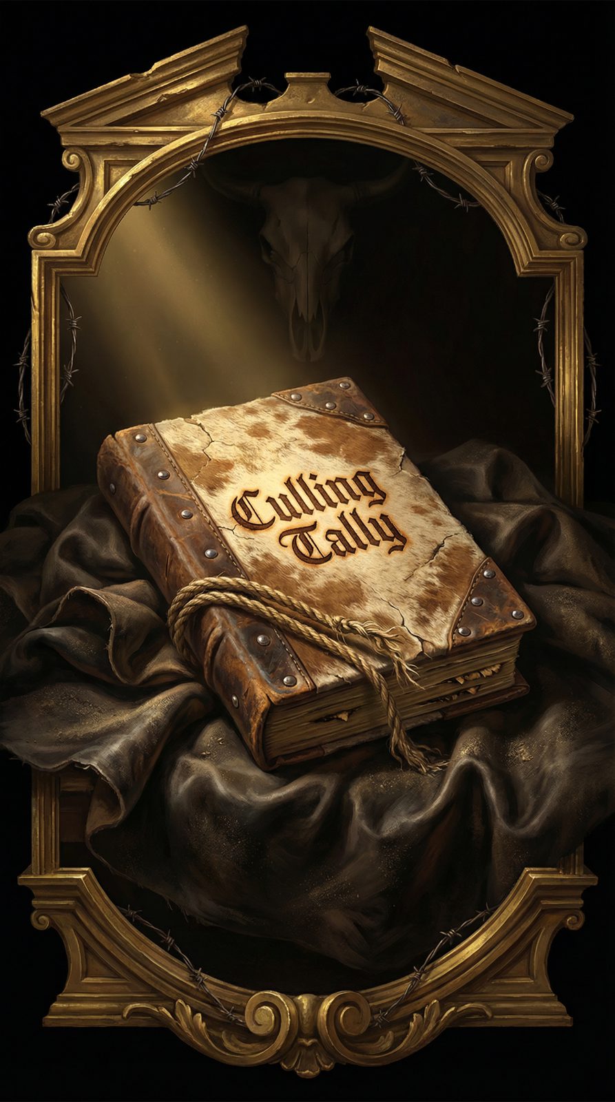 A weathered tally book bound in sun-bleached cattle hide stretched over mesquite frame, its pages made from pressed prairie grass that holds brand marks like flesh holds scars. Each elimination burns a notch into the paper, the char never fading, the count never lying. The binding is triple-strand lariat rope, frayed from constant handling but never breaking, and iron rivets mark the corners like the eyes of judgment watching every entry.