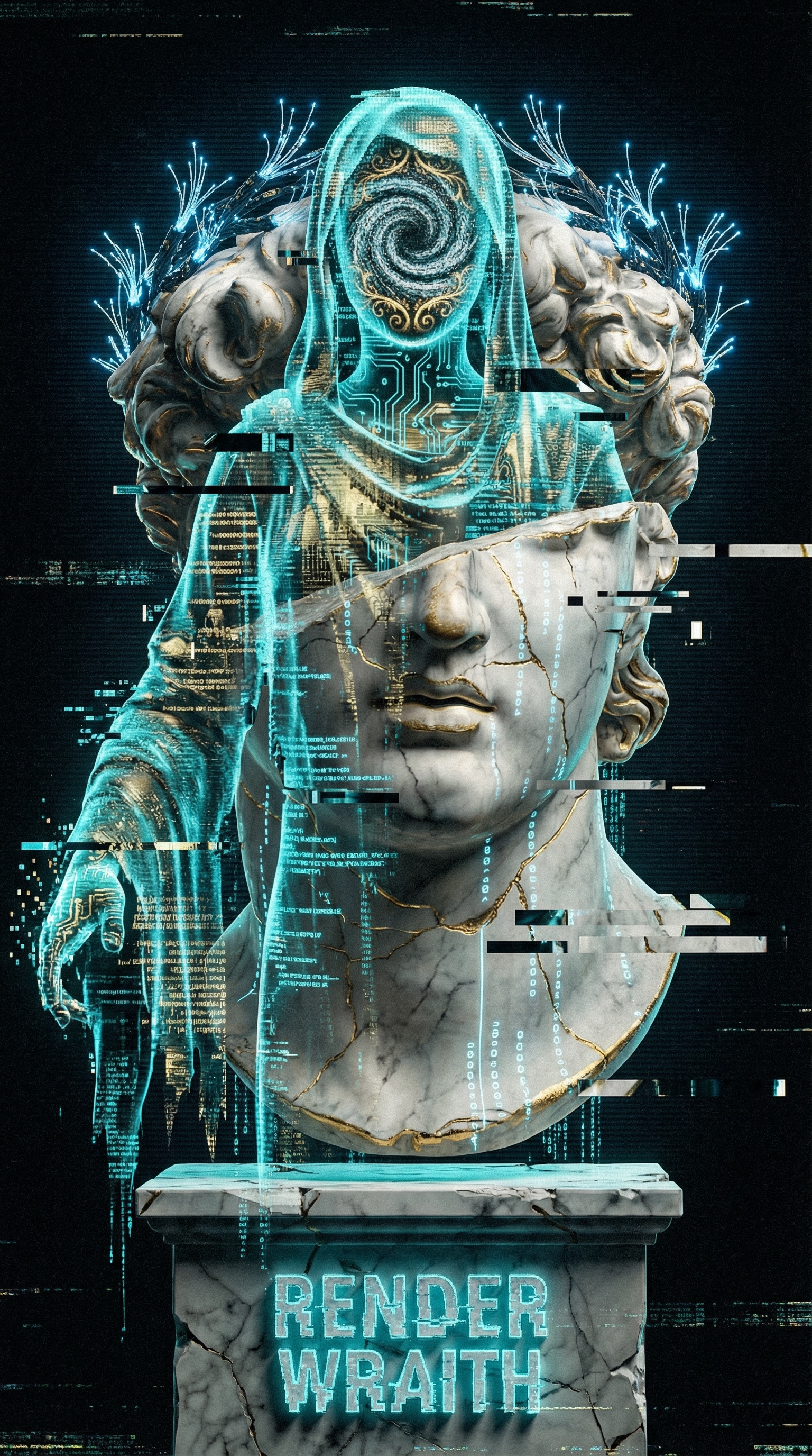 The Render Wraith appears as a humanoid silhouette composed entirely of fragmented pixels that constantly shift and reorganize. Where its face should be, only static interference swirls, and its body is wrapped in tattered robes made of corrupted data streams that trail behind it like dying code. Gold Baroque filigree patterns pulse faintly beneath its translucent skin, the only hint of the classical aesthetic that permeates the simulation. It can phase through solid objects and speaks in corrupted audio bursts that occasionally render as intelligible warnings.
