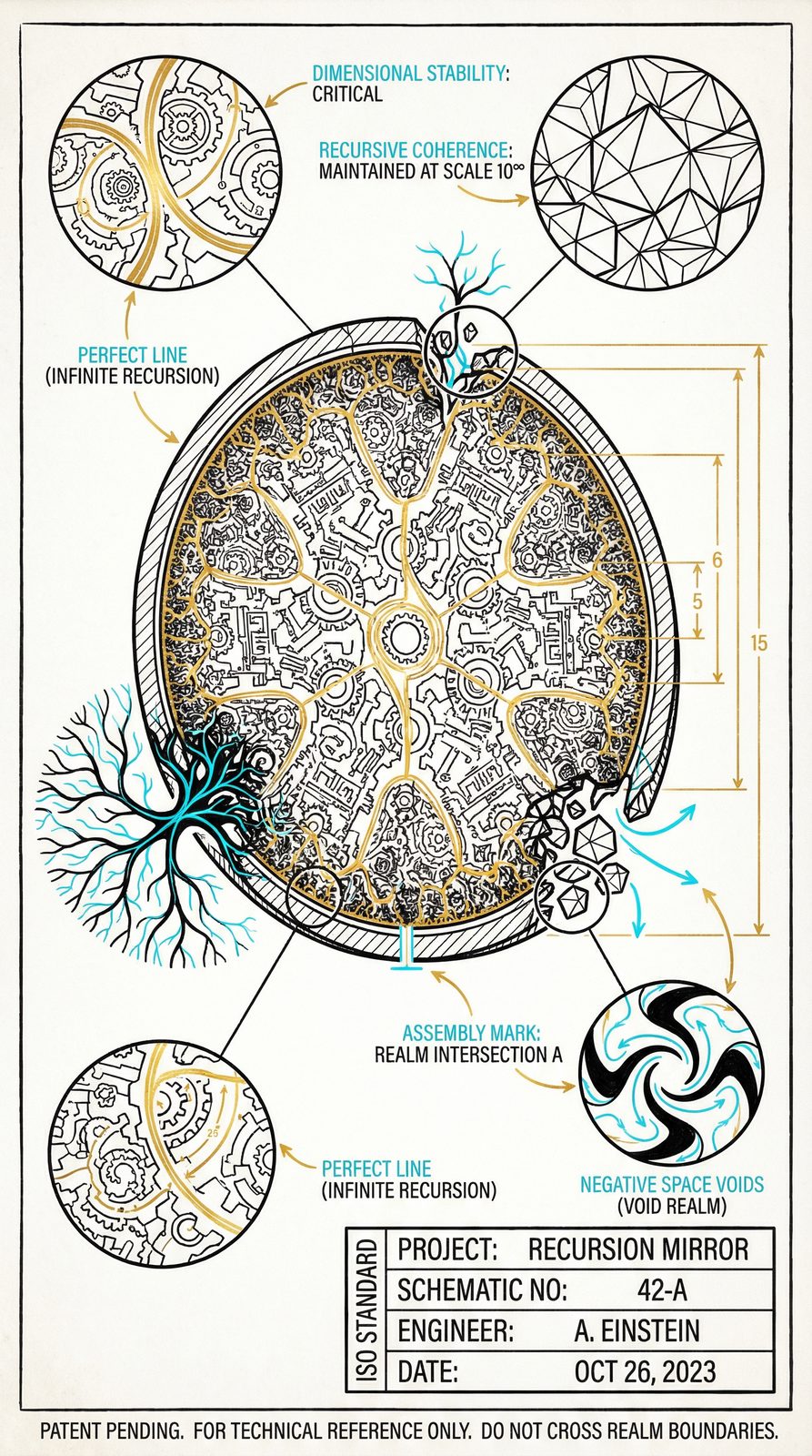 The Recursion Mirror exists as a non-Euclidean reflective surface whose fractal frame recursively repeats its own pattern into mathematical infinity, each iteration smaller but no less complete than the last. Its surface continuously shifts between organic growth patterns, geometric tessellations, and negative space voids, displaying all three dimensional interpretations simultaneously without contradiction. When a true Perfect Line is thrown, the mirror can fragment into smaller recursive copies, each maintaining perfect coherent reflection with the whole, allowing multiple Linewalkers to witness the same universal constant from their individual perspectives.