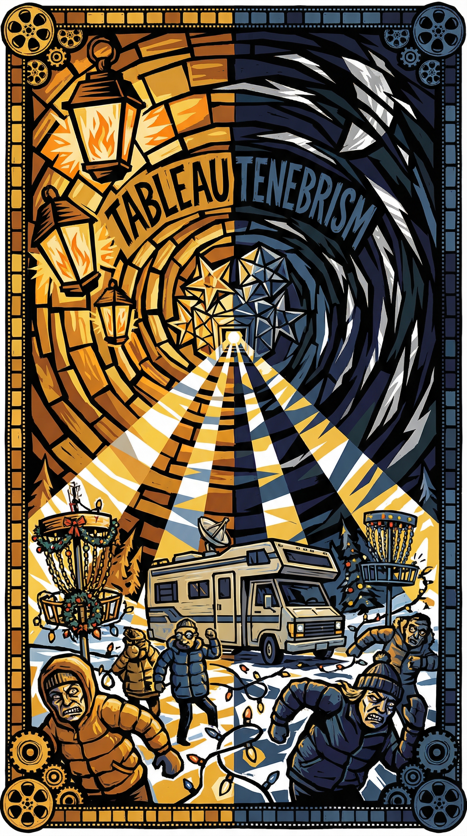 Tableau Tenebrism manifests as a column of living chiaroscuro—half warm amber luminescence, half deep indigo shadow—spiraling through winter air like a sentient theatrical spotlight. Thousands of miniature lantern flames orbit its core like a planetary system, each flame capable of projecting different intensities and hues onto the cinematic scenes below. Where its light touches metallic film-reel surfaces, it etches permanent patterns of illumination that define the emotional architecture of each frozen moment. Its temperature shifts based on emotional content—radiating warmth for heartwarming camaraderie, chilling to icy blue for dramatic tension, and blazing gold for transformative character growth.