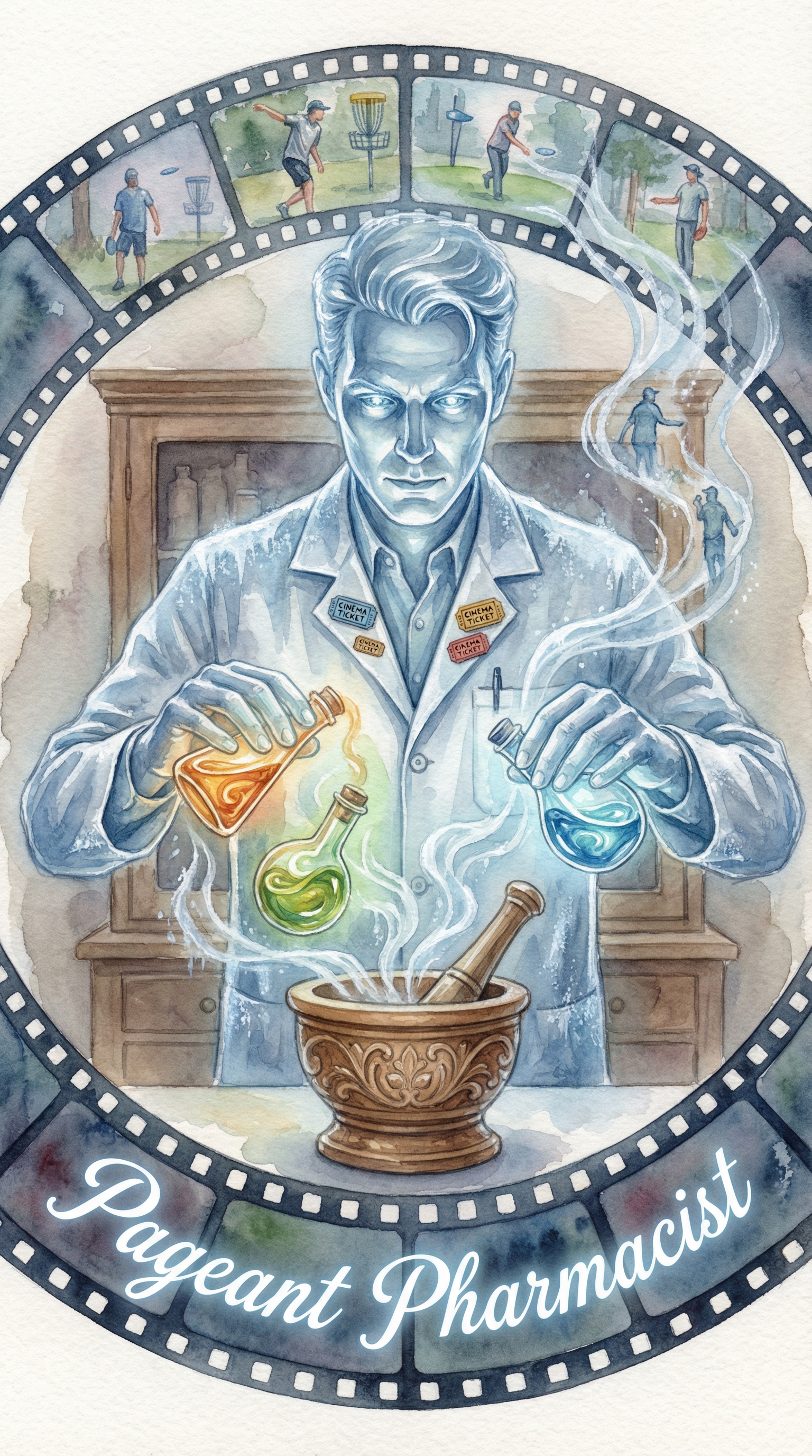 Crystallized in the North Pole's experimental laboratory when a master toymaker accidentally combined theatrical snow globe chemistry with pharmaceutical precision, creating an entity that could compound exact doses of character interactions to heal communities through competitive disc golf play and charitable giving. The Pageant Pharmacist emerged from this fusion with the sacred mission of transforming winter isolation into brotherhood through carefully prescribed tableaux.