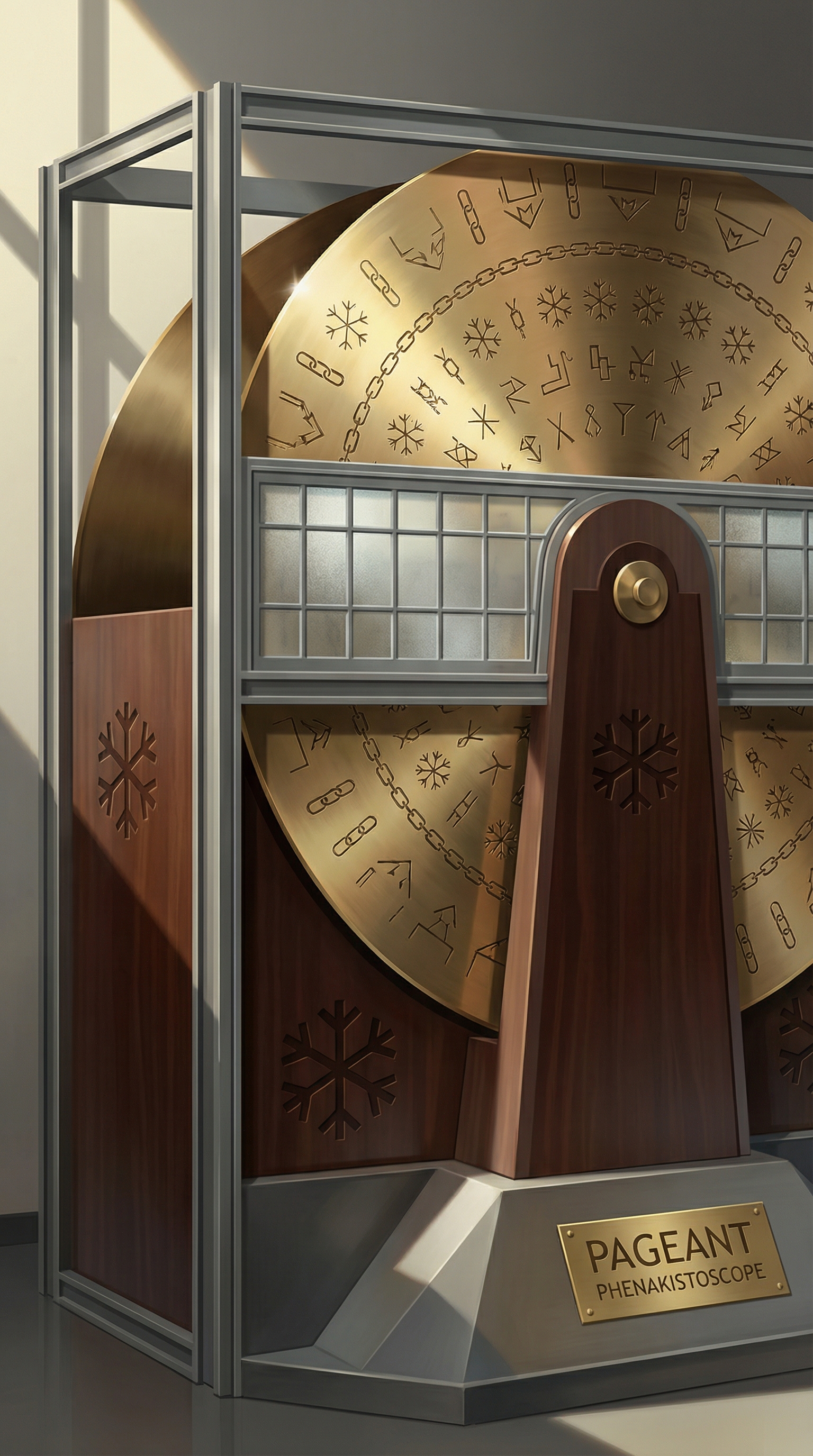 The Pageant Phenakistoscope manifests as a massive brass disc mounted in an ornate Victorian frame, its surface etched with thousands of sequential scenes showing every possible interaction between holiday archetypes. When hand-cranked, the disc spins beneath a frosted viewing portal while an internal lantern projects light through precisely cut slots, creating the illusion that elves, ghosts, conductors, and winter spirits are moving through a living Christmas pageant. The mechanism's film-reel gears click with the rhythm of chains hitting baskets, and each rotation generates a unique combination of character positions, poses, and environmental details that has never appeared before and will never repeat.