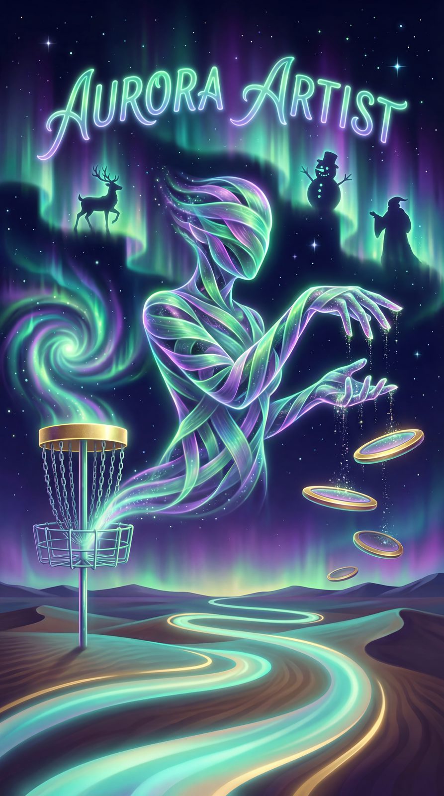 The Aurora Artist originated when a disc golfer's clutch putt under the northern lights fused with winter magic, creating a being that now roams courses to paint the skies with hope and camaraderie.