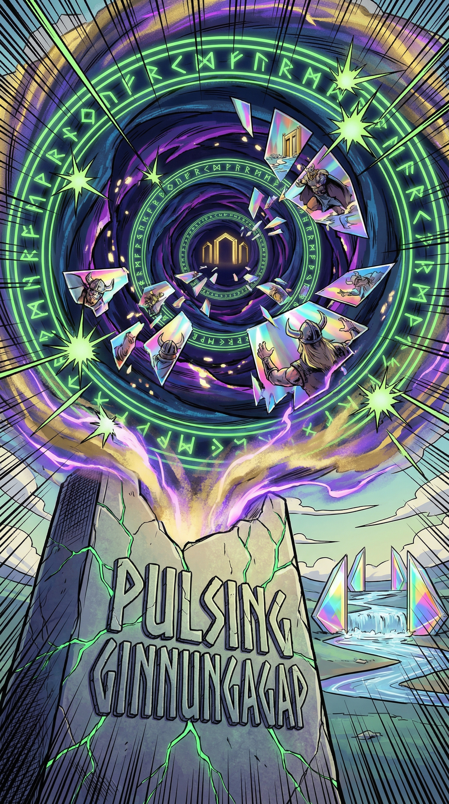 The Ginnungagap manifests as a self-consuming void with fractal edges that spiral inward infinitely, each recursion revealing glimpses of eliminated warriors dissolving into cosmic geometry. Its boundaries shimmer with prismatic coronas where reality itself fragments and refracts. The void pulses rhythmically, synchronized to the collective heartbeat of remaining competitors, growing more intense with each league as more warriors are consumed.