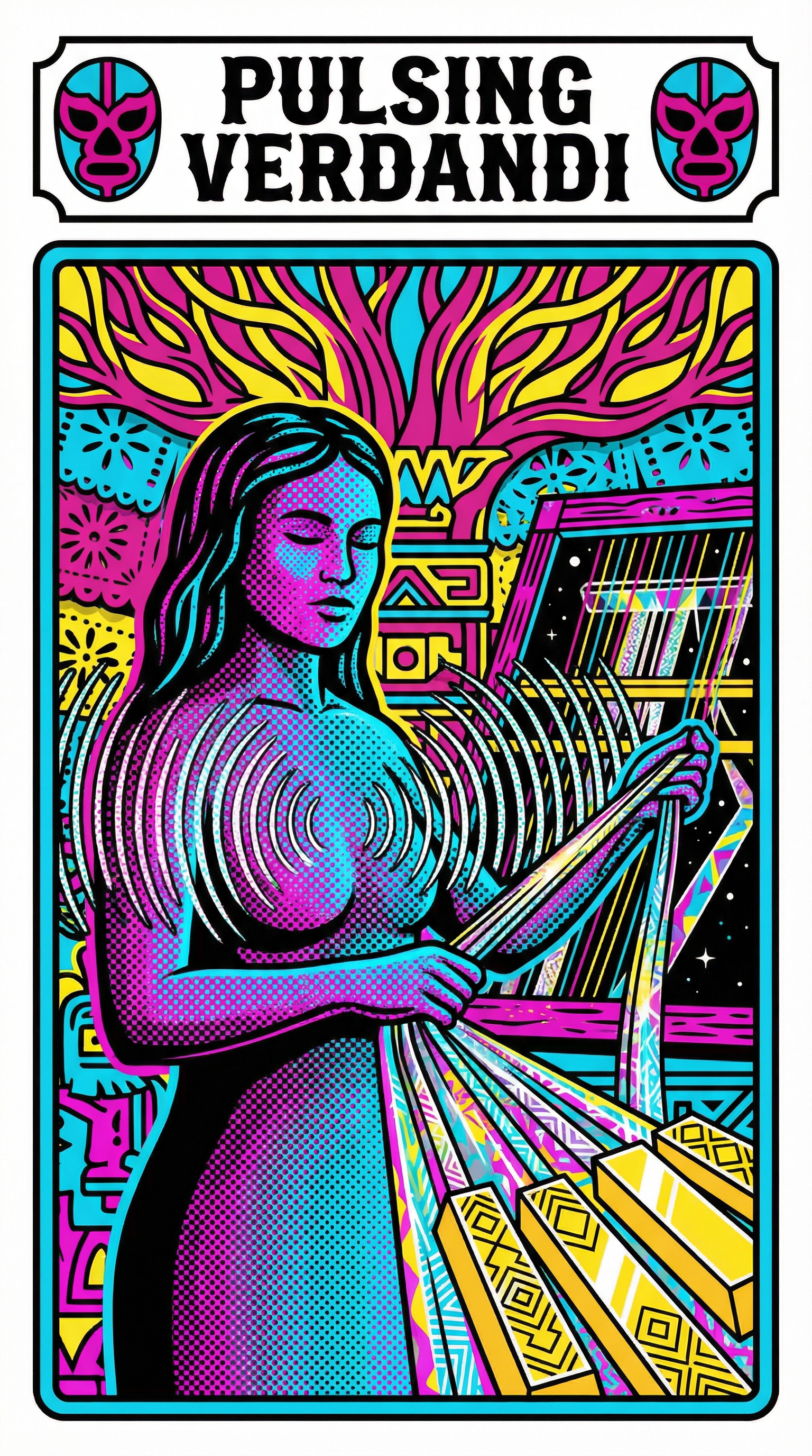 At the intersection of Yggdrasil's roots where Urdarbrunnr pools, Verdandi sits at her loom weaving not past or future, but the shimmering NOW. Each throw of each disc across all eight weeks exists simultaneously in her perception, and she pulls the threads that determine which warriors maintain their howl through the present trial, transforming potential into reality with every pulse of her cosmic weaving.