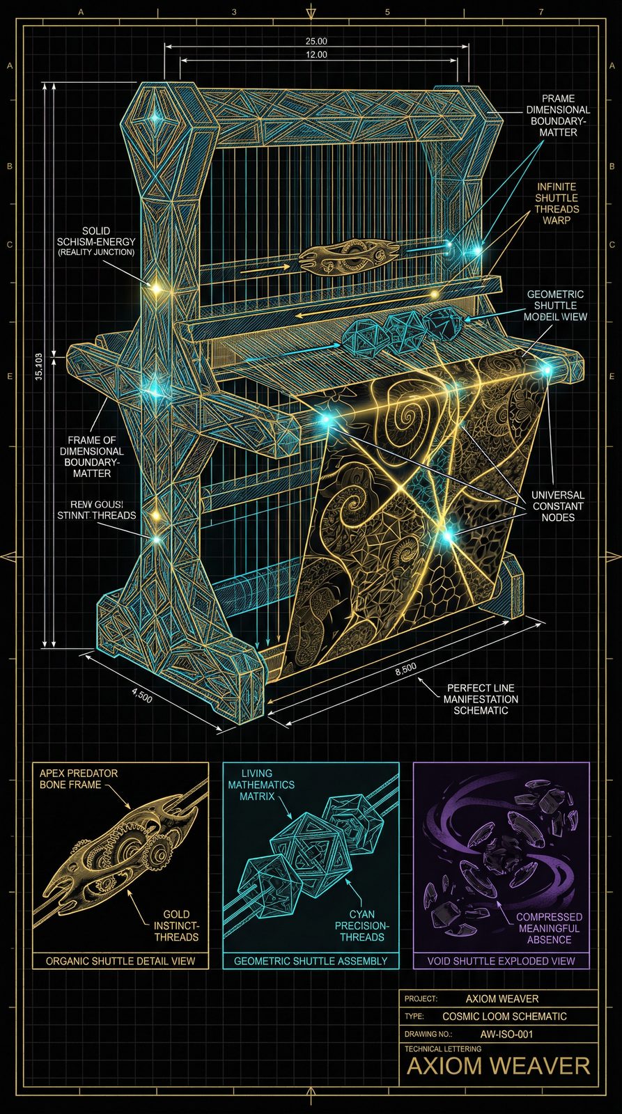 The Axiom Weaver manifests as living loom-work, its form composed of three distinct thread-types that continuously interweave: organic filaments pulsing with predatory gold, geometric strands of crystalline cyan precision, and void-threads of meaningful absence that define pattern through what they're not. When an axiom achieves stability across all three dimensions, the entire weave emits a brief harmonic tone—the sound of reality confirming truth. Fractal shuttle-paths constantly trace through the weave, showing the active construction of new universal constants in real-time, each pattern repeating at infinite scales to demonstrate how local truth becomes cosmic law.