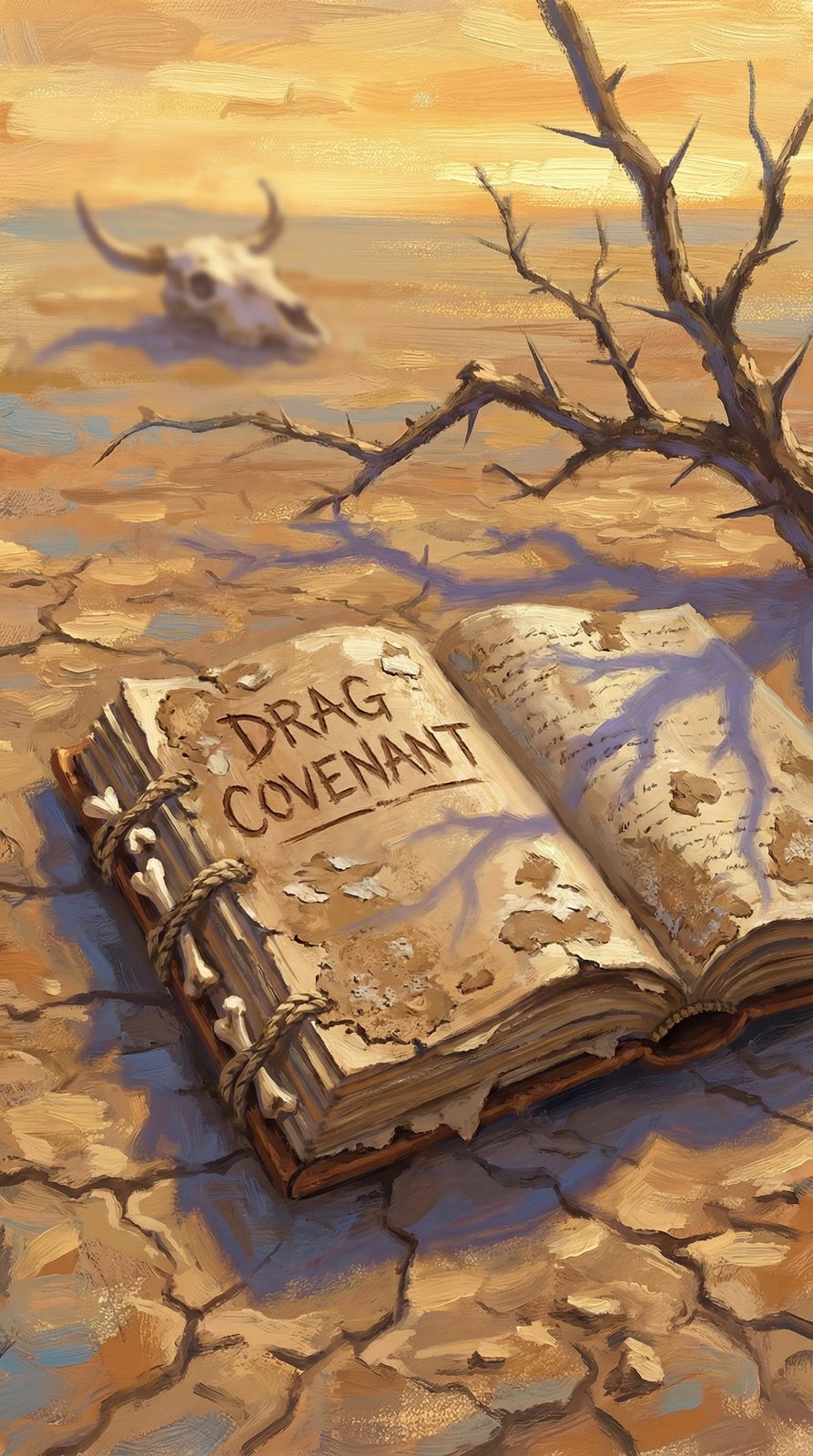 The Drag Covenant takes form as a thick leather tome bound with braided drag rope stained by decades of prairie dust and cattle blood, its surface crusted with layers of dried mud that crack and flake with each opening to reveal burn marks underneath. Previous drag riders branded their most significant culling judgments directly into the hide before passing it forward, creating a palimpsest of elimination that grows heavier with each season. The pages inside are stiff with dust and sweat, each one documenting not just who was sent to the bone yard, but which drag rider made the call and whether the herd benefited from the culling. Embedded bone fragments and rope fibers serve as physical testimony to the covenant's authority.