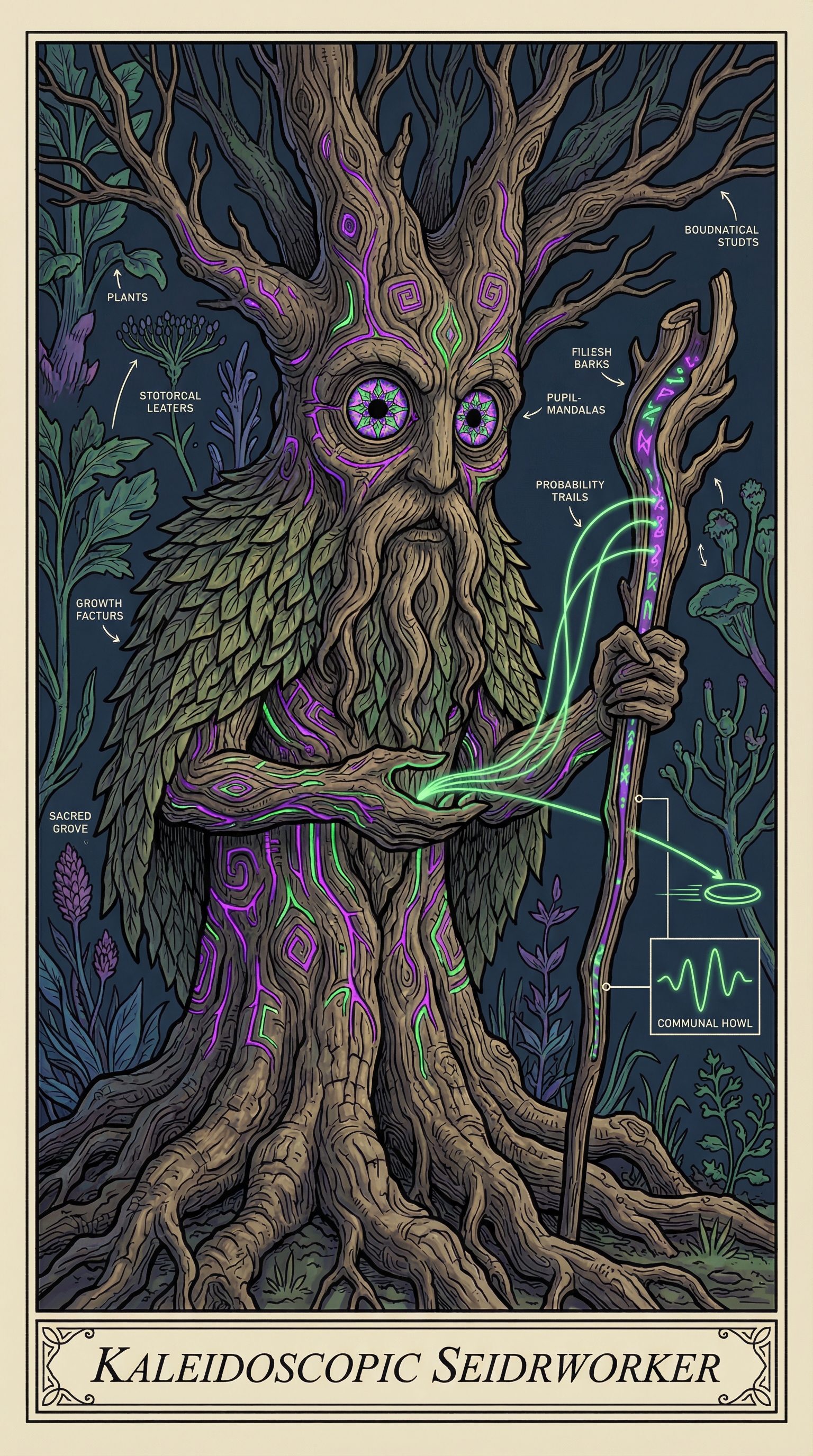 The Kaleidoscopic Seidrworker performs the continuous seidr ceremony that maintains the sacred grove as a space between worlds, ensuring each throw, each howl, each creek crossing exists in the liminal state where Norse mythology and disc golf merge into genuine vision quest. Their ritual work peels away layers of mundane consciousness across all eight trials, revealing which warriors can perceive the true nature of the Hall of the Howl.