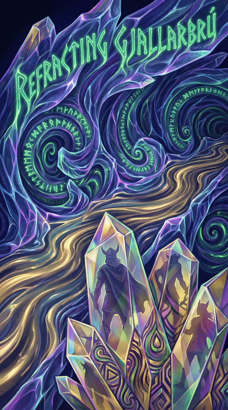 Gjallarbrú manifests as a bridge of crystallized sound waves, each strand refracting the midnight blue and electric purple of the sacred grove into prismatic pathways. The bridge exists simultaneously at the end of each trial but appears radically different depending on the observer's state of consciousness—some see it as solid gold, others as dissolving fractals, still others as pure vibration. Most powerfully, the bridge refracts each approaching warrior into multiple possible futures, showing all potential paths to Valhalla at once. Only those in altered consciousness can perceive its true form.