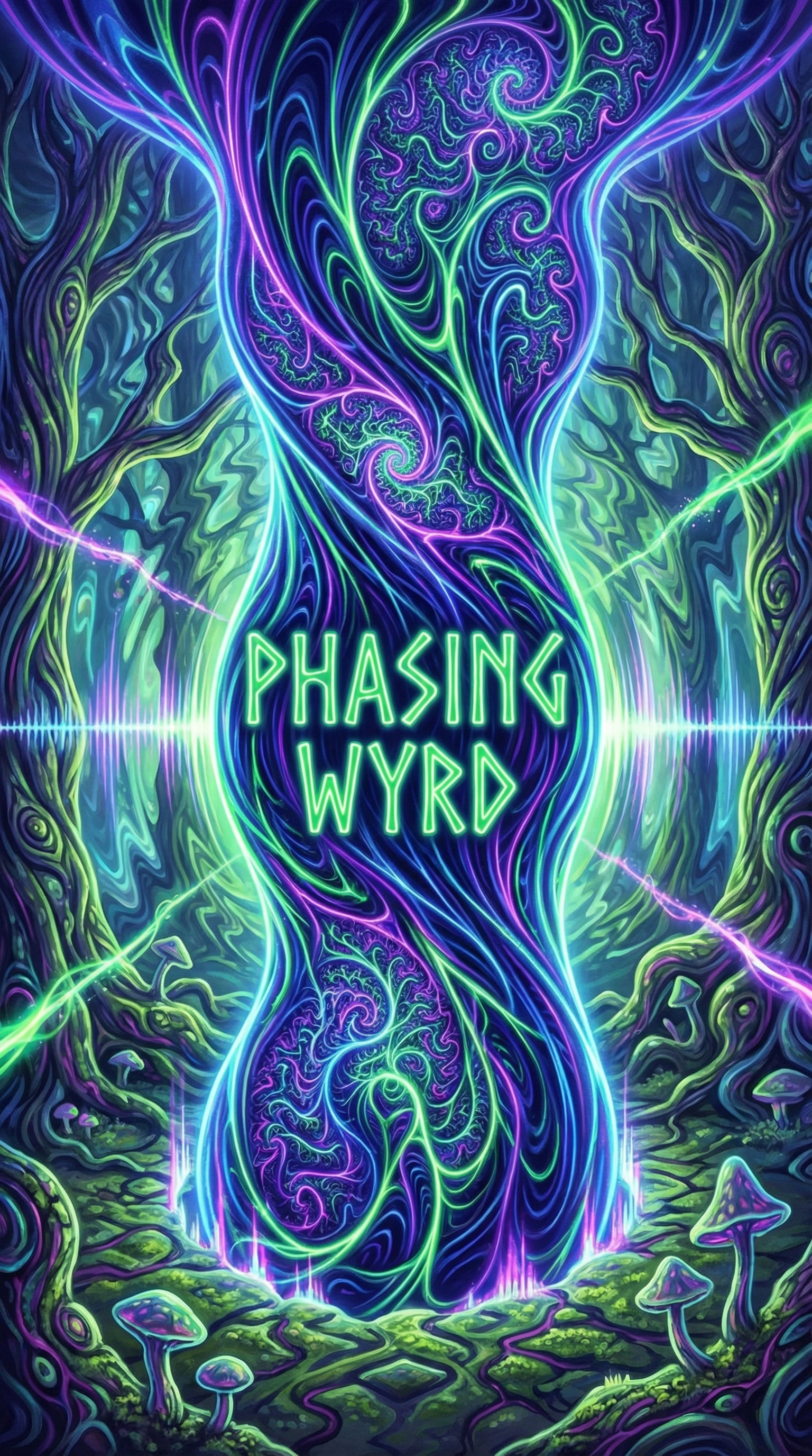 Phasing Wyrd shifts between visible and invisible states, never fully manifesting in one phase for long. It is composed of fractal howl-patterns that recurse infinitely, each layer containing echoes of howls from different trials, different leagues, different warriors. It pulses with the collective frequency of all warriors' howls, changing color based on phase state - flowing between midnight blue and electric purple, shot through with veins of neon green rune-glow.