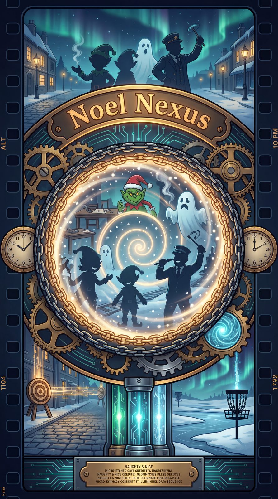 Double-sided Naughty and Nice ranking disk with micro-etched credits that illuminate as milestones are reached. Chain-wreath portal ring that shifts from deep blue to gold when cross-league cameos activate. Aurora-reactive ink that reveals hidden pathways between snowy scenes under night glow. Snowflake mando sigils that project dynamic action lines during storms, integrating course weather into the visual narrative.