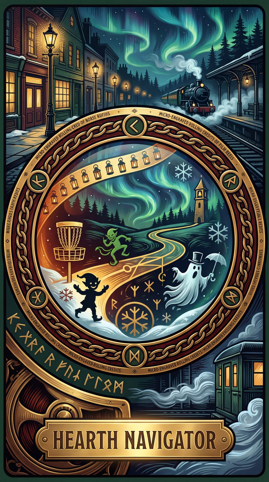 Solstice midnight: a film reel winked at a lodge hearth mirror and—lol physics—Hearth Navigator walked out. Golden pathlines lit bell towers, proximity bells rang, chains spun like wreaths. Think Stranger Things portal, but cozy. Yes, for a tag.