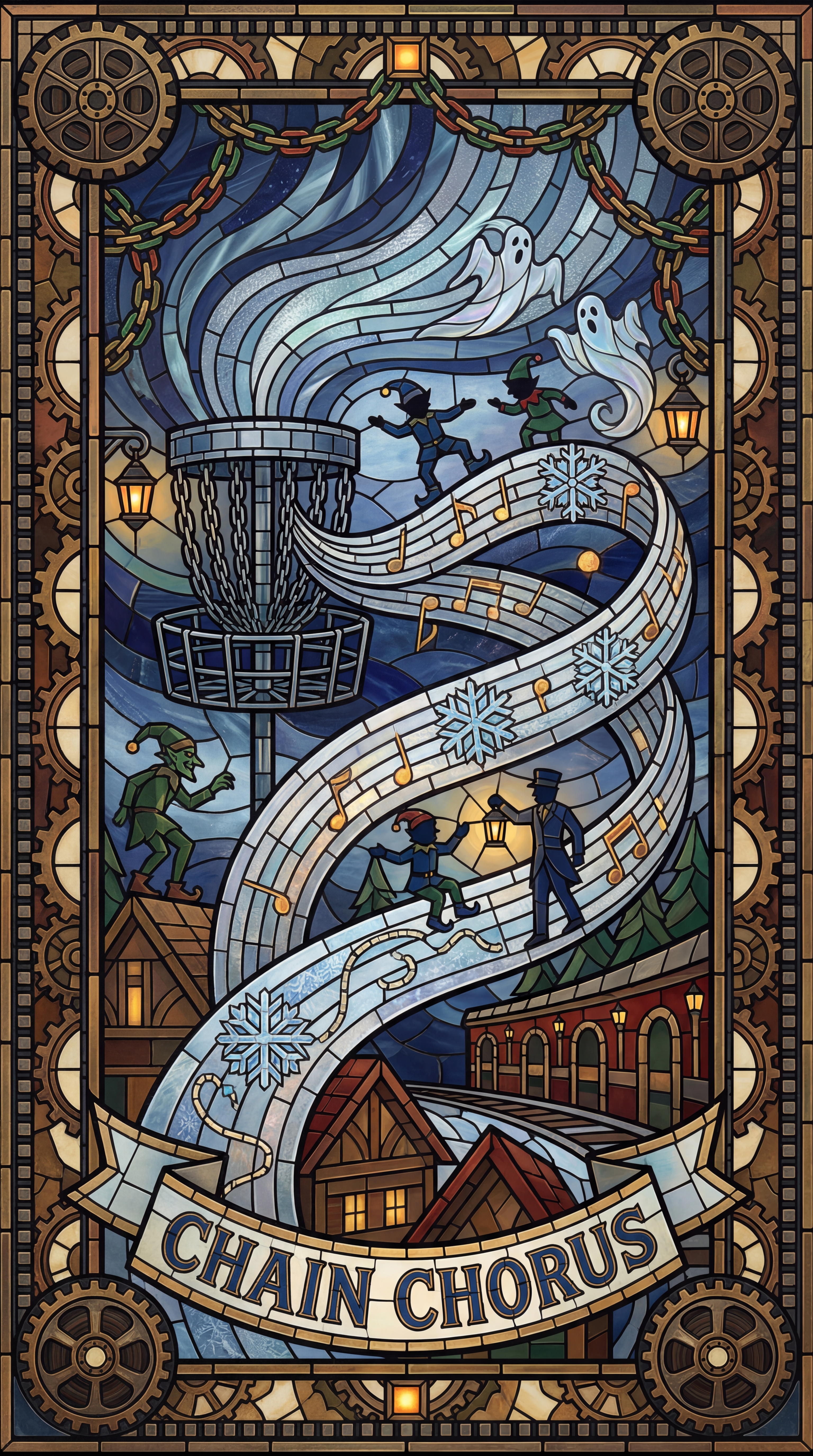 The film-reel border renders charitable milestones as glowing notes that animate during play. Chain-wreath sigils briefly open to invite elves, green mischief-makers, Victorian ghosts, townsfolk, conductors, and winter spirits into the tableau. Snowflake mandos are etched as musical staves, turning flight lines into measures that visually score each throw. Lantern-lit embossing warms or cools to match league palettes and moods.