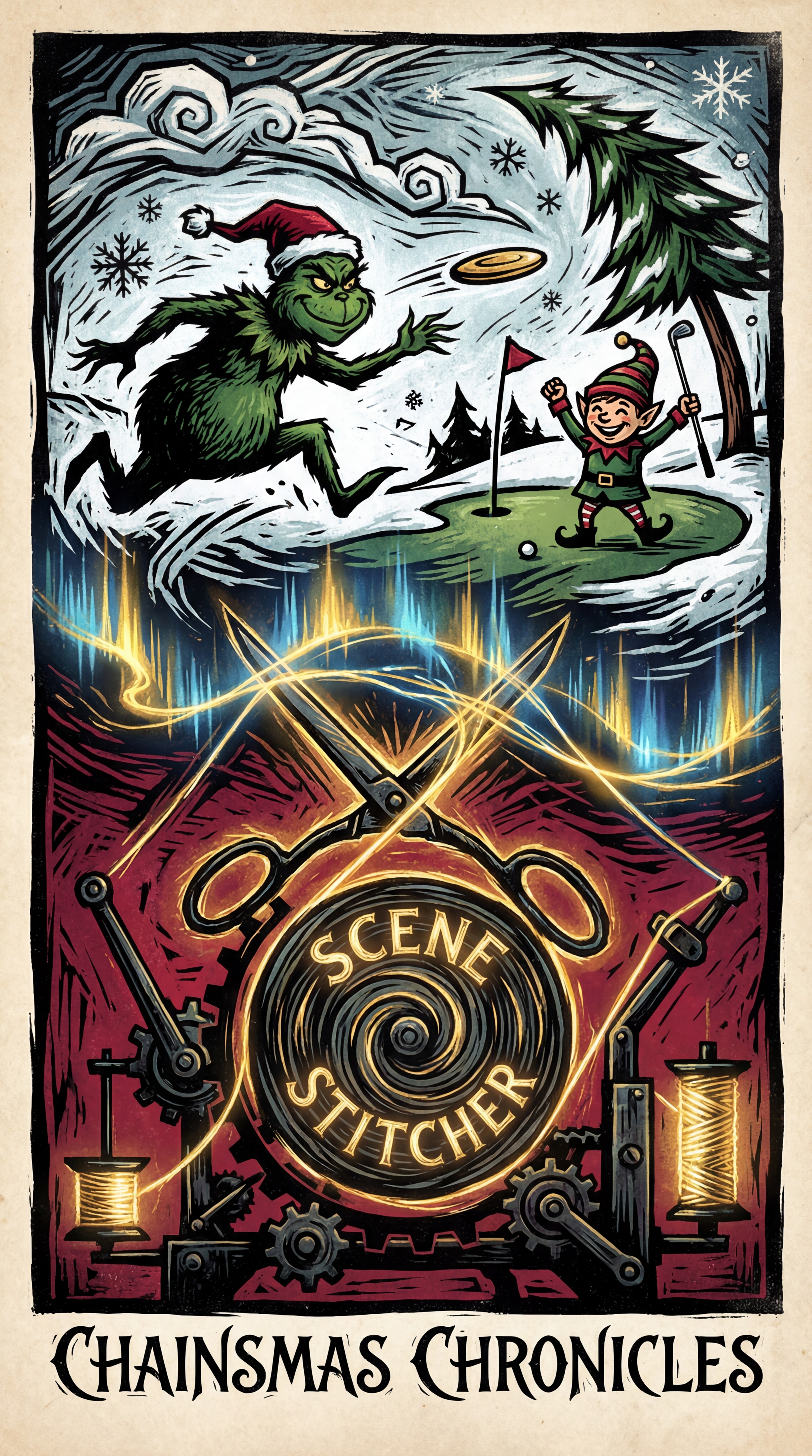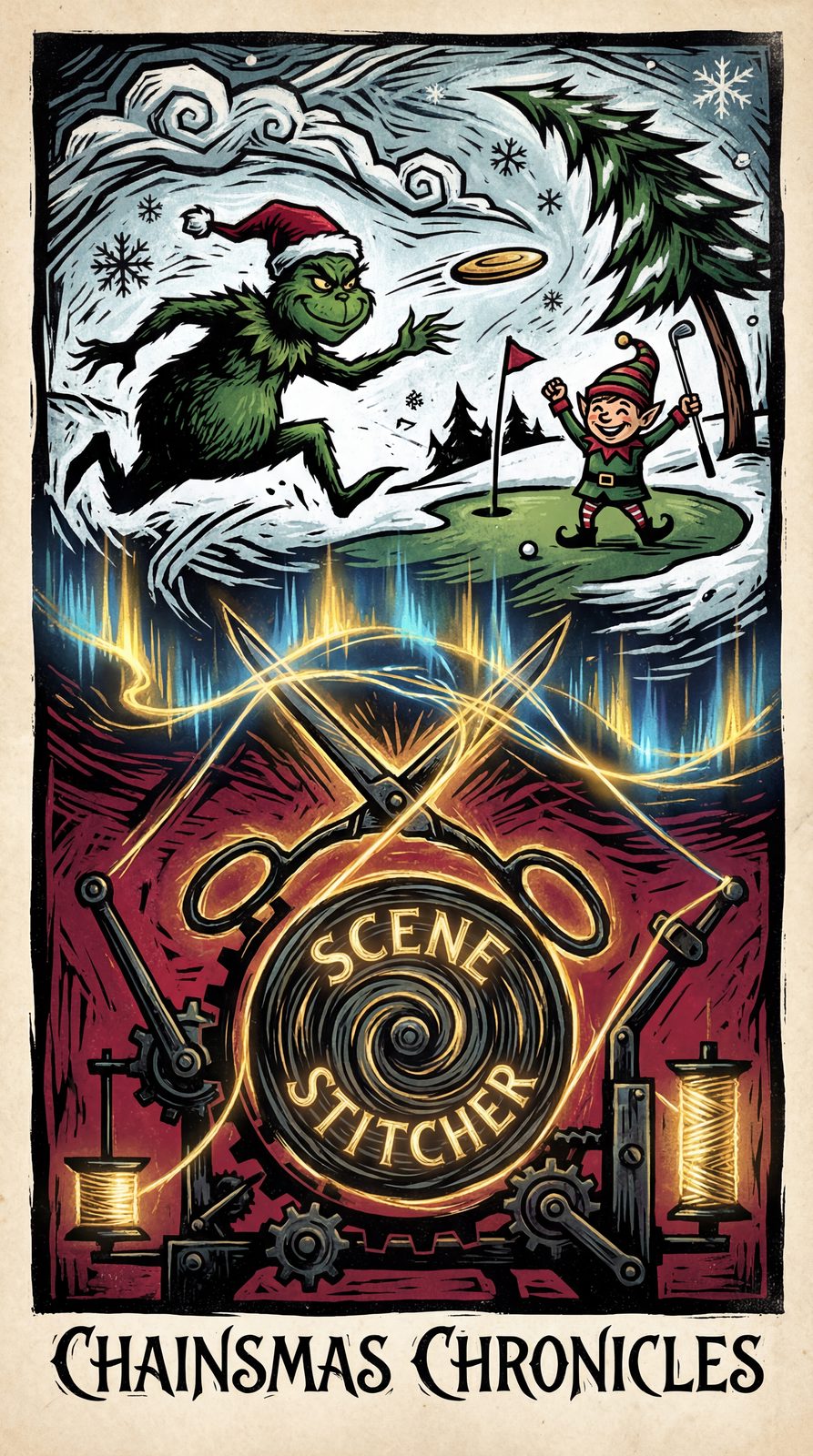When the final reel of the year's first 'Chainsmas Chronicles' film snapped in the projector, the spilled frames and light fused with the director's desperate wish to preserve the magic. From this chaos emerged the Scene Stitcher, a being whose sole purpose is to meticulously recompose those perfect holiday moments onto durable tags.