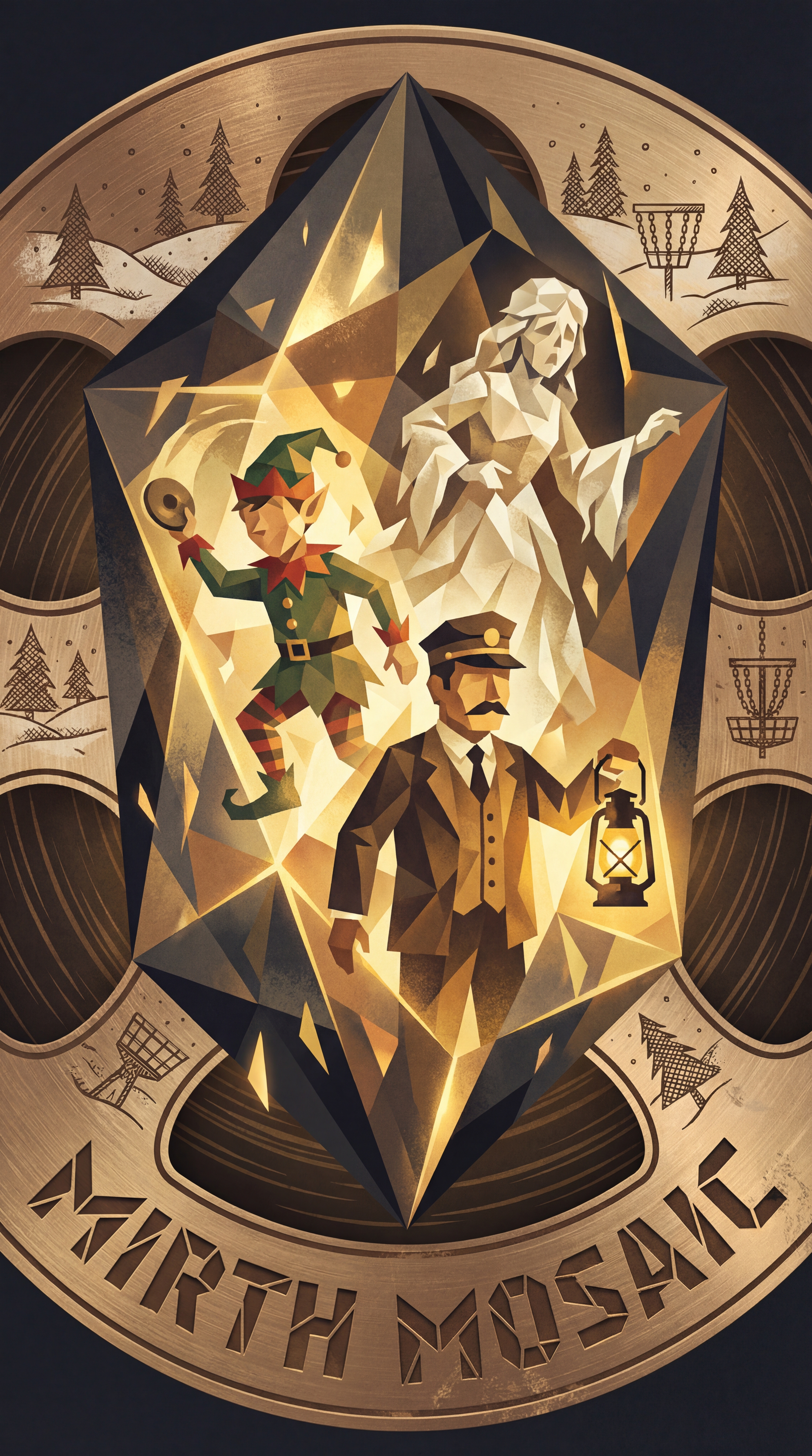 The Mirth Mosaic appears as an ever-shifting tableau of glowing, tessellated fragments. Its border is a worn film reel etched with micro-scenes from across the Chainsmas Chronicles, and its surface is cool except for a pulse of warmth when a new festive archetype is locked into place within a tag's design. The central image constantly reconfigures, previewing potential character combinations for future illustrations.