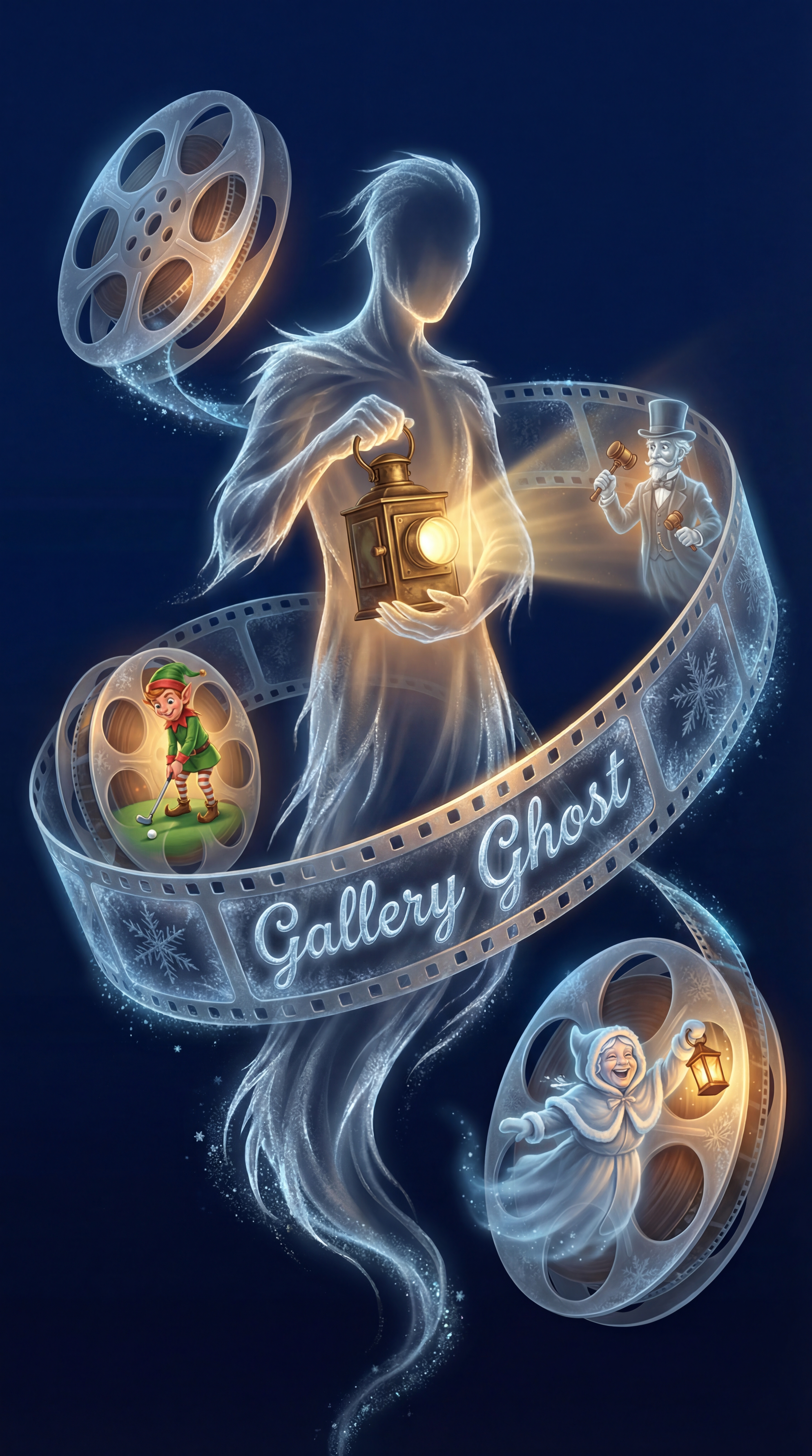 The Gallery Ghost coalesced from the residual narrative magic and collective holiday spirit infused into the very first set of bag tag illustrations. It is not the ghost of a person, but the living soul of the growing cinematic universe itself, born to curate and connect the ever-expanding gallery of frozen moments.