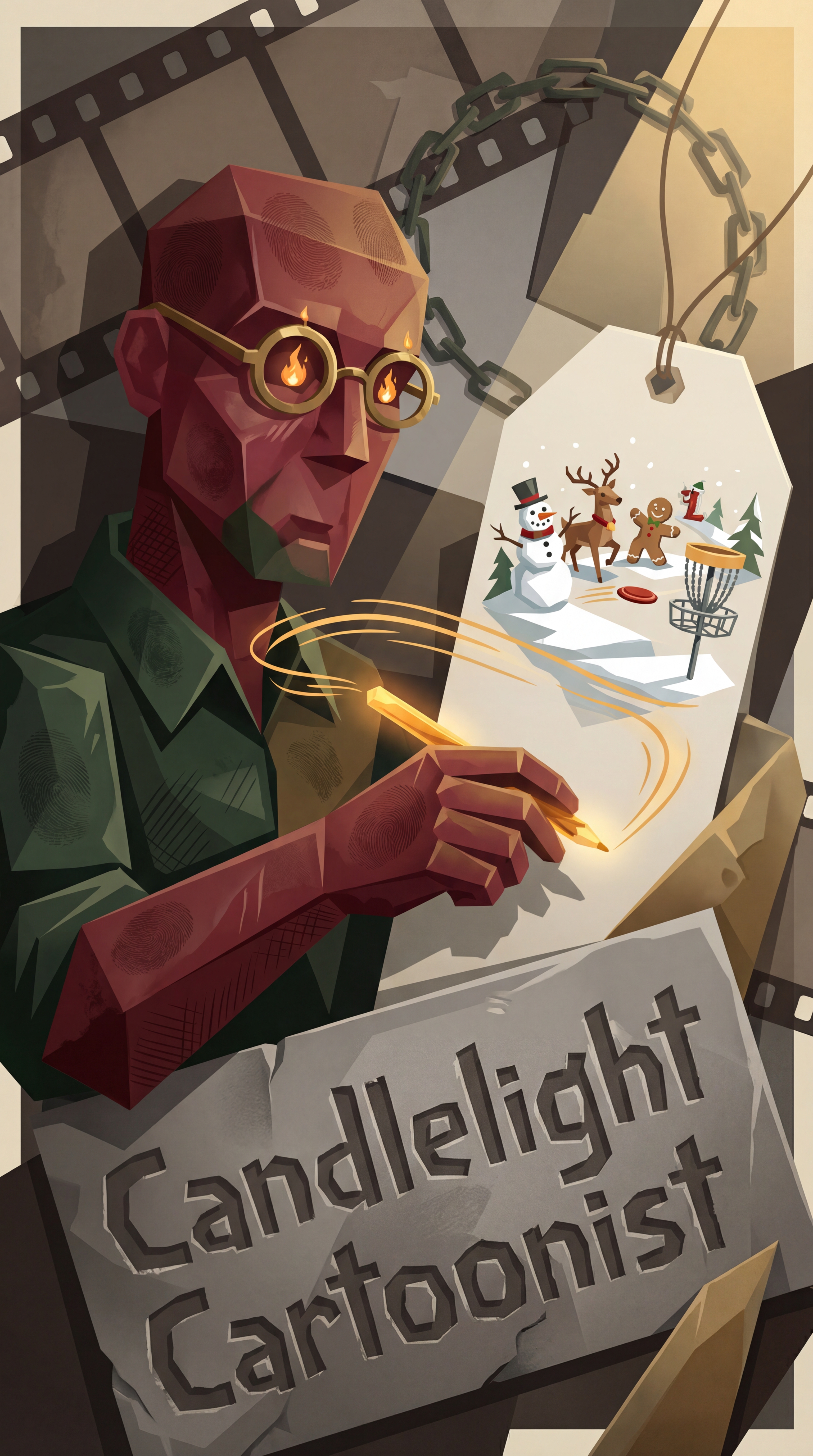 The spirit of Candlelight Cartoonist #29, lurking in the projector’s glow, first beheld Caleb Starnes shanking a disc into a pine bough. It was a perfect woodcut of failure! His PDGA lineage (a prophetic #195768) and his steadfast willingness to ‘sketch’ new lines in the frost called out. The tag, craving drama, slid into his bag. A match made in a silent film nightmare.