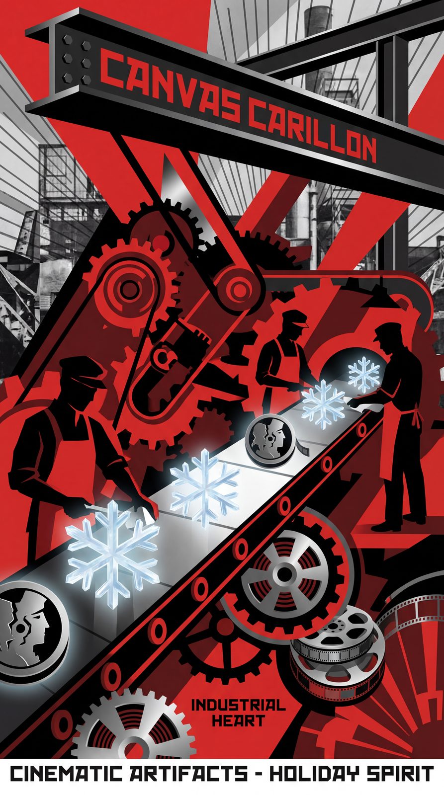 The Canvas Carillon was forged in a hidden annex of the North Pole workshops, where the first film reel of holiday camaraderie was being etched alongside the tuning of the Great Yule Bell. A spill of enchanted ink over the bell's harmonic schematics caused them to fuse, creating an entity whose very purpose is to translate the echoing bonds of winter warrior brotherhood into timeless, cinematic illustrations.