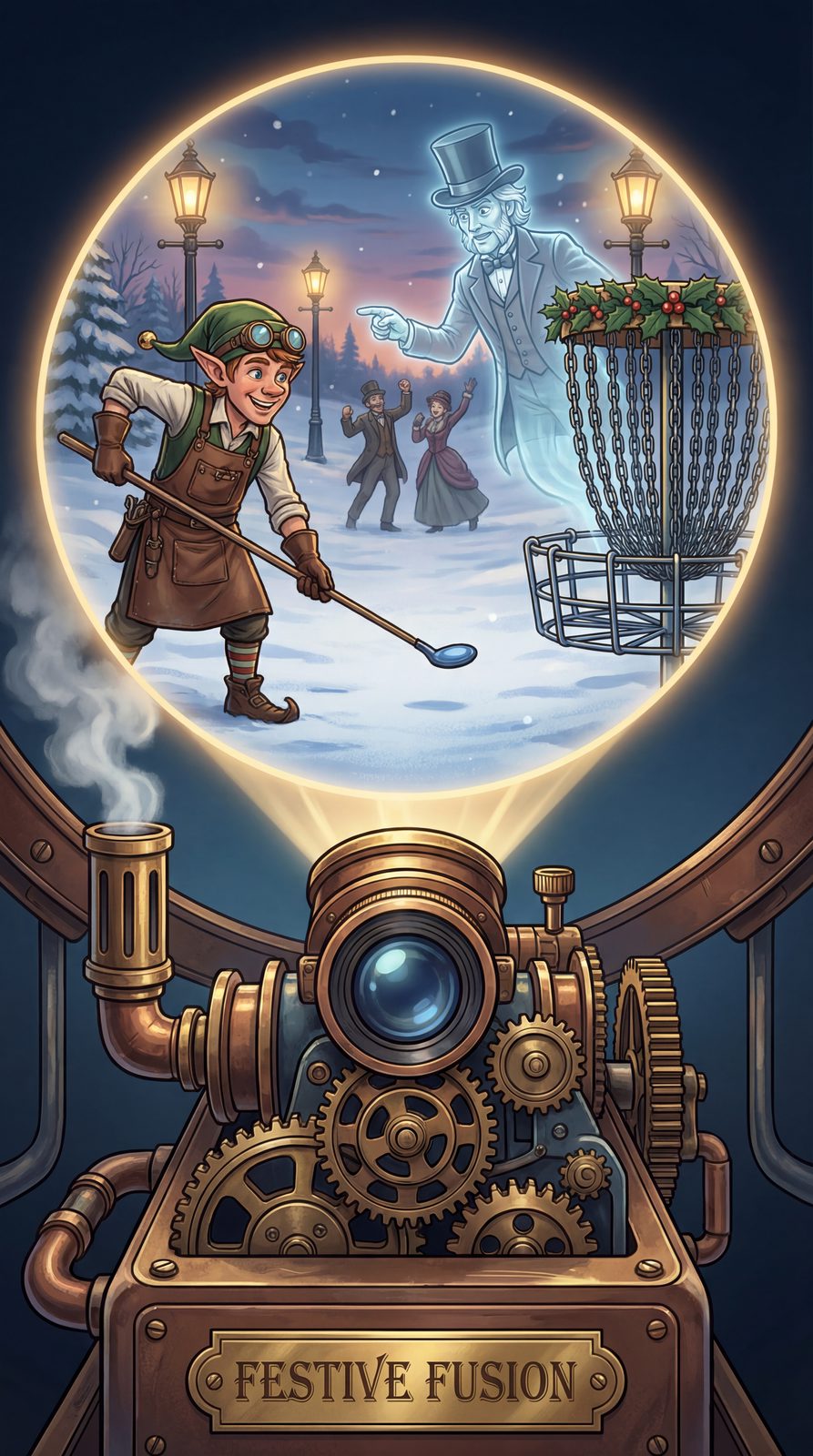Born from the first collision of a festive cheer wave and a disc golfer's perfect throw during a snowy round, the Festive Fusion emerged to capture and blend holiday magic into tangible scenes, now serving as the spiritual force behind the bag tag illustrations.