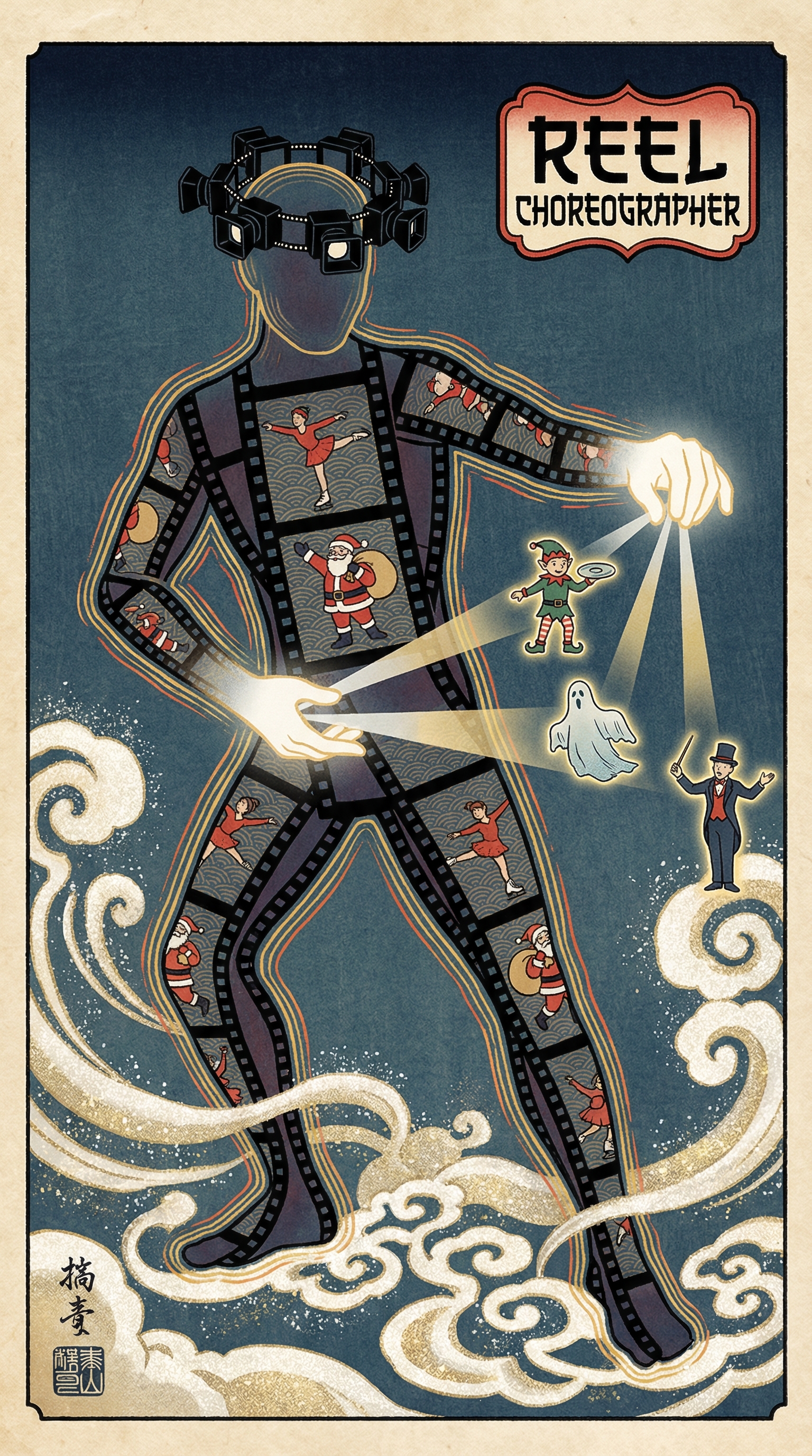 The Reel Choreographer manifests as a translucent figure whose body is composed of perpetually unwinding film strips, each frame showing a different character mid-gesture. Its hands are formed from frozen spotlight beams that can gently reposition archetypes into new poses. When it moves through a scene, it leaves trails of glittering snow that crystallize into dance notation symbols, mapping the kinetic pathways of elves mid-throw, ghosts mid-float, and conductors mid-celebration. Its voice resonates as a peculiar harmony—orchestral crescendos blended with the musical ring of chains.
