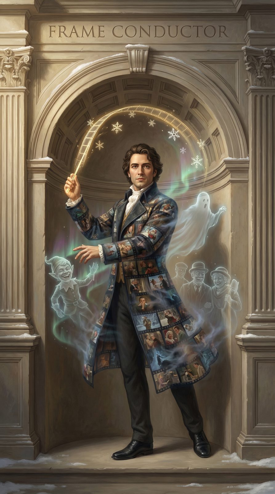 Born from the first moment a projectionist synchronized multiple Christmas films simultaneously in a forgotten theater, the Frame Conductor emerged when overlapping holiday stories created a new temporal rhythm. It gained the power to orchestrate character appearances across infinite winter tableaux, conducting the precise moments when elves, ghosts, townsfolk, and spirits converge in each unique scene.