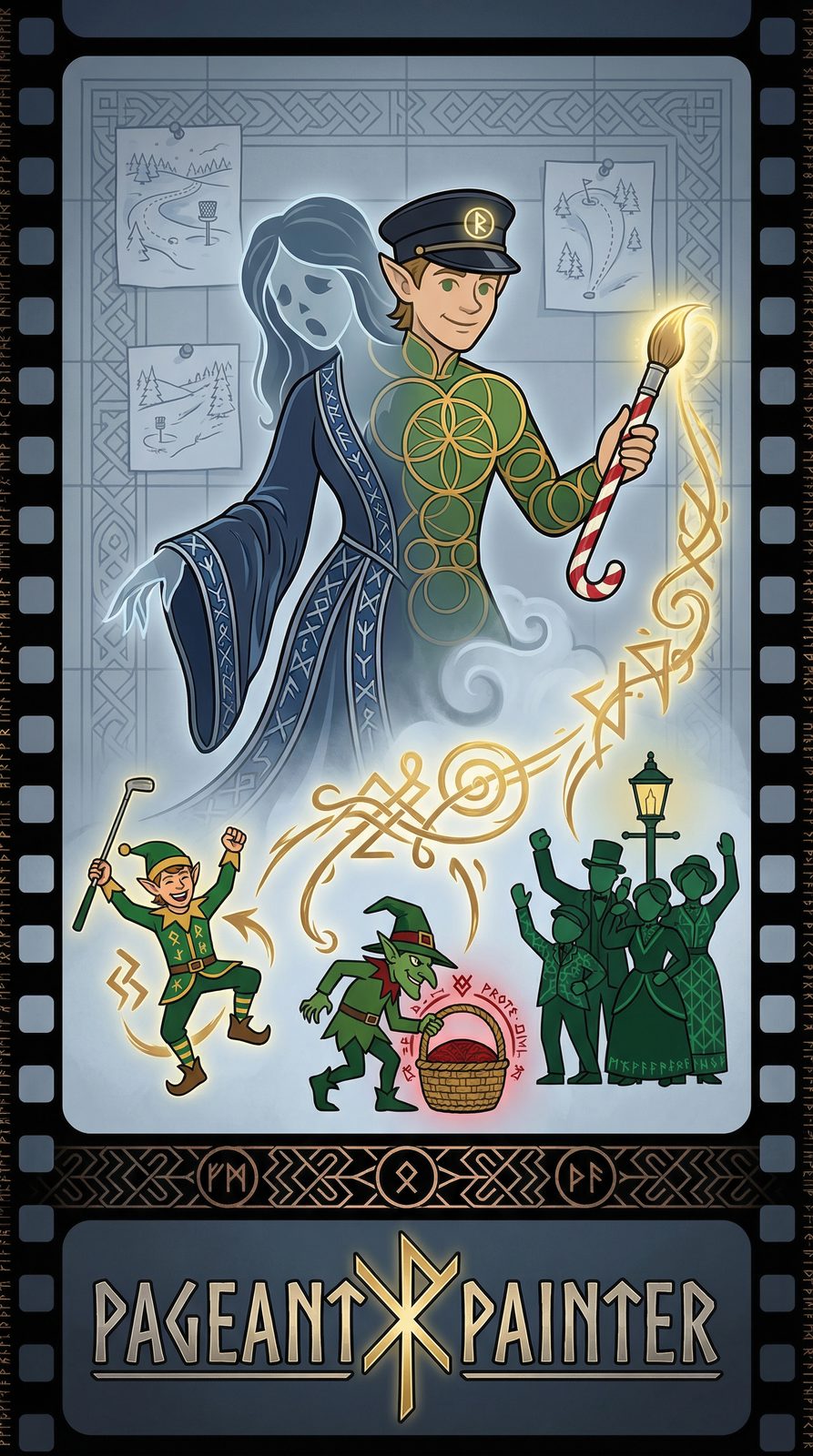 The Pageant Painter wields an enchanted paintbrush carved from a candy cane that grew on the first Christmas tree planted at a disc golf course, its bristles woven from aurora borealis light. Their palette contains infinite pigments distilled from the charitable acts and competitive triumphs of winter warriors—deep crimson from shared victory, gold from generous mentorship, icy blue from resilient rounds in blizzards. Each brushstroke carries the living essence of holiday archetypes, allowing the Painter to summon elves mid-celebration, ghosts in mysterious float, or conductors watching from steam-clouded platforms, arranging them into compositions that feel simultaneously spontaneous and perfectly choreographed.