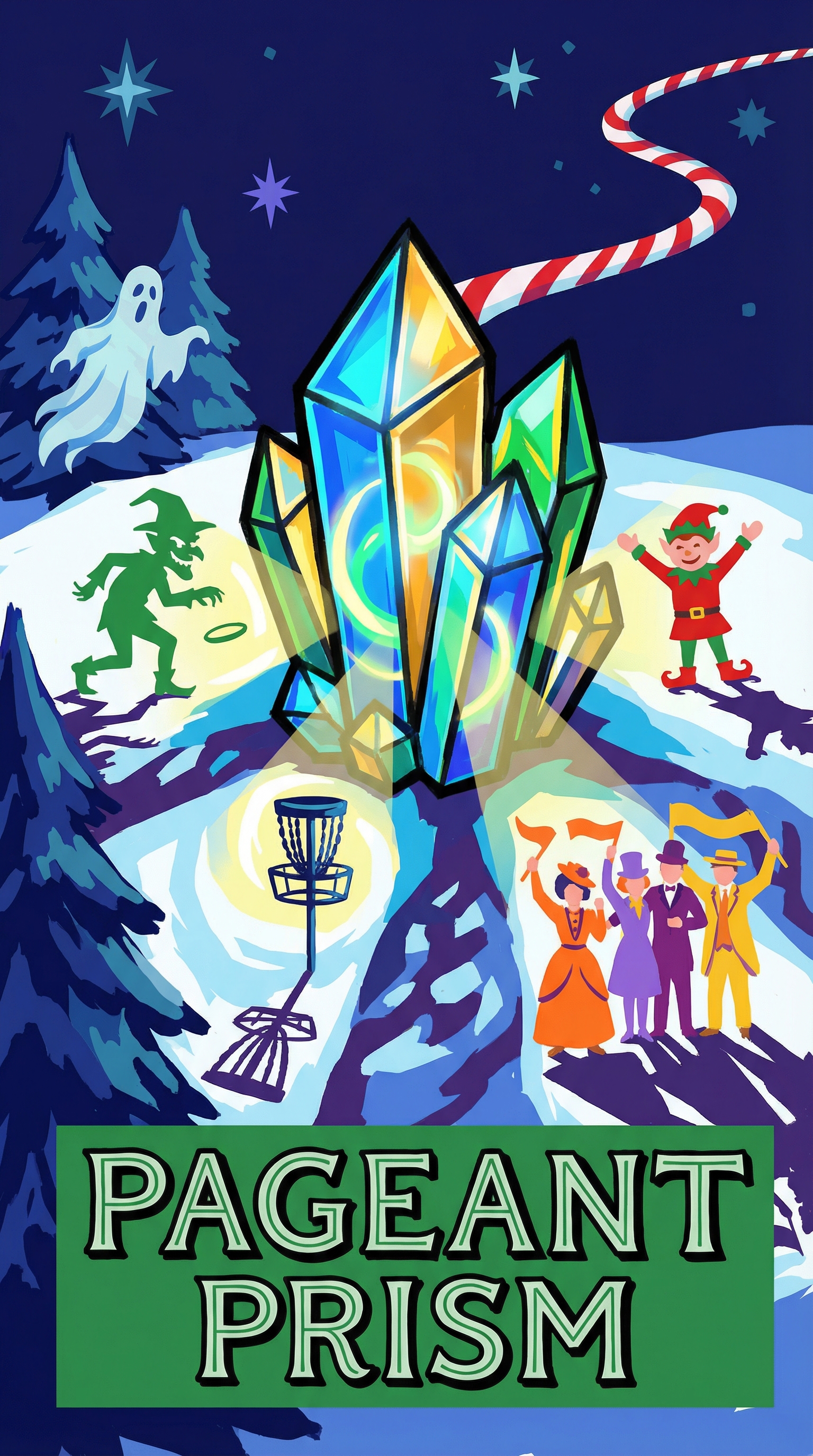 The Pageant Prism exists as a multifaceted crystalline structure with each facet capable of isolating a distinct combination of holiday archetypes from the collective story pool. Film reel perforations run along its edges, glowing with warm amber light when active, while its internal structure contains a perpetual aurora borealis effect that swirls with the colors of every Christmas film ever made. When narrative energy from the ten leagues passes through, it projects miniature silhouettes of characters onto nearby surfaces before permanently etching their interactions onto physical bag tags.