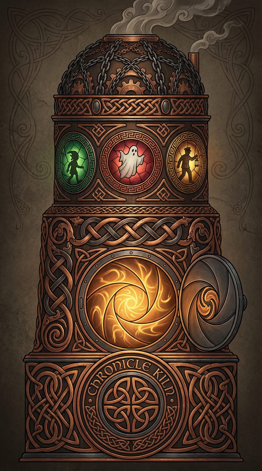 The Chronicle Kiln manifests as a massive, Victorian-era furnace wrapped in film-reel chains, its iron body etched with scenes from all ten leagues in vintage woodcut style. Stained glass viewing ports glow with the silhouettes of holiday characters mid-interaction—elves celebrating, ghosts floating, conductors gesturing—each pane showing a different frozen moment. Temperature gauges along its brass-fitted sides measure narrative intensity in units of 'brotherhood bonds' and 'charitable acts,' while its chimney exhales glittering snow mixed with golden sparks that smell faintly of hot cocoa and pine.
