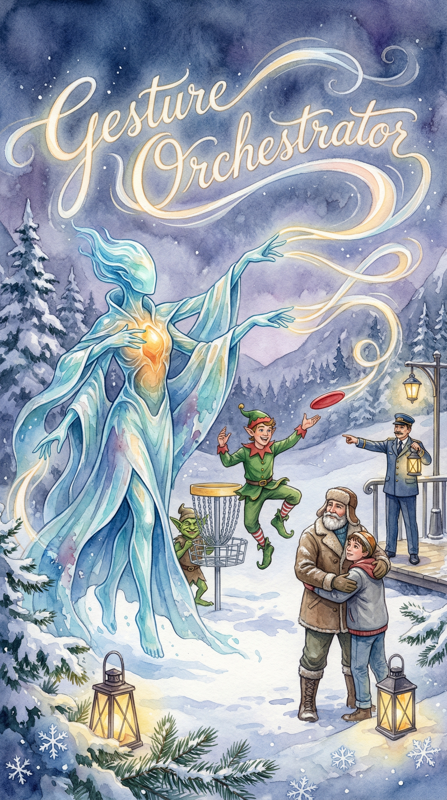The Gesture Orchestrator possesses translucent arms that multiply and extend across illustrated scenes, each hand frozen mid-direction. Its chest cavity reveals swirling film strips cataloging every possible holiday gesture—from triumphant disc releases to comedic tumbles. Golden sight-lines project from its eyes, mapping optimal character positioning, while its fingers leave glowing gesture-trails that linger in the frosty air, creating luminous choreography notes that guide holiday archetypes into their perfect poses.