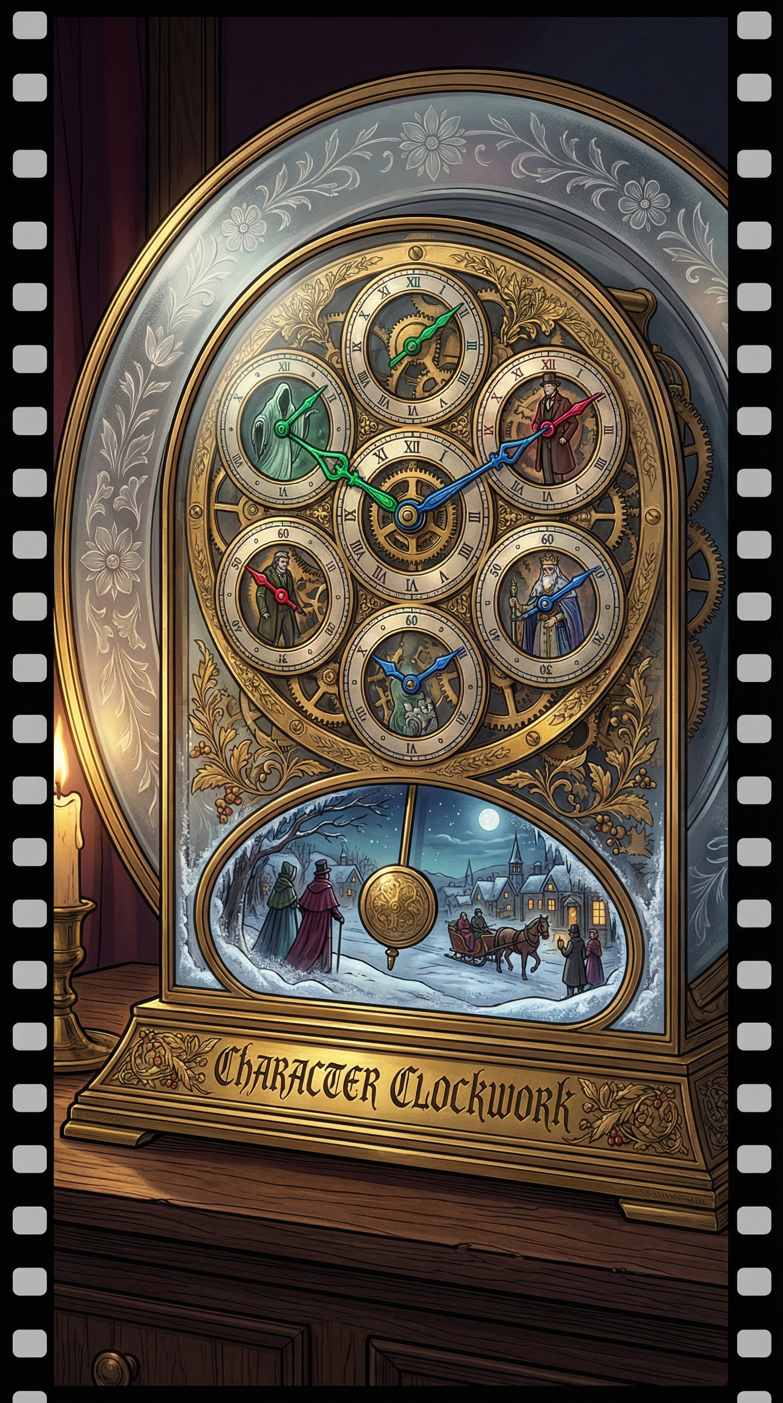 An ornate timepiece resembling a Victorian stage manager's console merged with a film editor's equipment, featuring brass gears that tick in syncopated rhythms, each gear representing a different holiday character's timeline, with a central pendulum that swings through miniature snow-globe scenes before freezing at the perfect composition. Multiple concentric dials track the movements of elves, ghosts, townsfolk, conductors, and winter spirits simultaneously, while glowing film-reel sprockets serve as hour markers around its crystalline face, revealing the intricate mechanical ballet within.