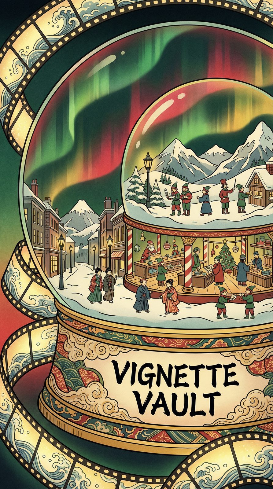 The Vignette Vault manifests as an impossibly vast crystalline structure, each of its infinite chambers containing a single frozen moment in perfect stasis—cheerful elves mid-throw, Victorian ghosts floating mysteriously, train conductors watching in wonder. Its walls glow with shifting aurora light that changes color based on which league's scenes are being accessed, from the warm golds of Bedford Falls to the neon chaos of Griswold mayhem. Frost-etched catalog numbers spiral endlessly across its surfaces, each combination representing a unique arrangement of characters, poses, environments, and moods that has never been duplicated and never will be.