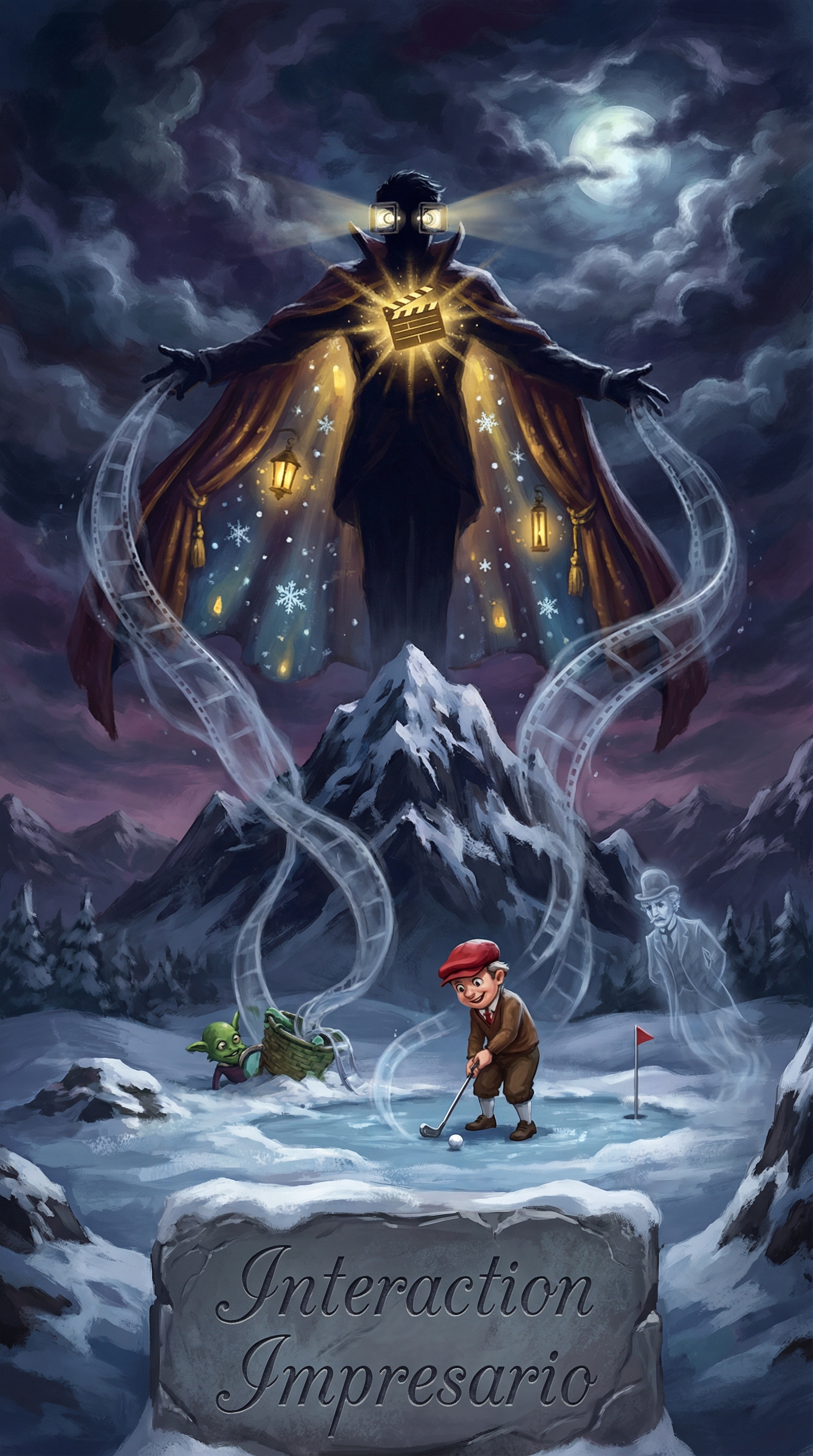 Manifesting as a luminous theatrical presence, the Interaction Impresario wears a cloak woven from actual cinema curtains that shimmer with swirling snow and warm holiday lights. Film reel ribbons flow from its form like conducting batons, guiding elves, ghosts, and townsfolk into their marks, while its clapperboard heart clicks audibly when the perfect moment crystallizes. Its director's viewfinder eyes constantly scan and reframe compositions, ensuring each scene captures the precise emotional beat required by the overarching narrative.