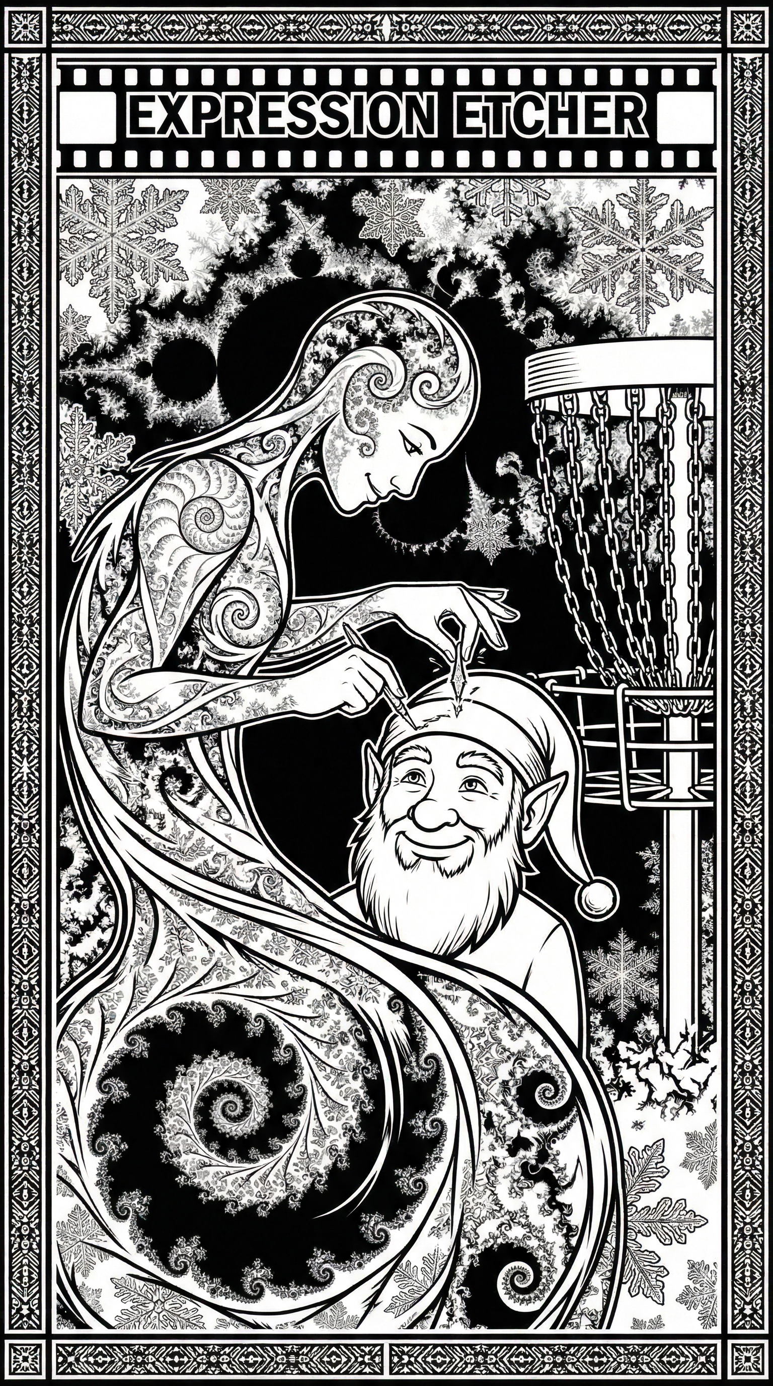 The Expression Etcher possesses infinite micro-chisels made of frozen emotion, each tool specifically crafted for different character archetypes—crystallized laughter for cheerful elves, frozen wonder for Victorian ghosts, preserved mischief for green creatures. It wears spectacles of winter-clear ice that reveal the true emotional states characters must convey, and carries a glowing palette of crystallized feelings harvested from genuine disc golf moments. The entity moves through illustrated scenes like winter breath on glass, its form shifting between vapor and solid as it works.