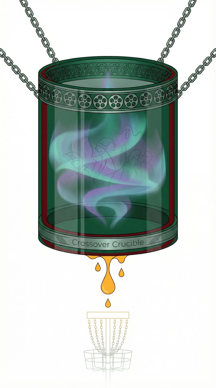 The crucible glows with film-reel patterns shifting between warm amber and icy blue, which is honestly more mood lighting than any disc golf tag deserves. But here we are, with a tag that can theoretically create Buddy-the-Elf-meets-John-McClane scenarios.