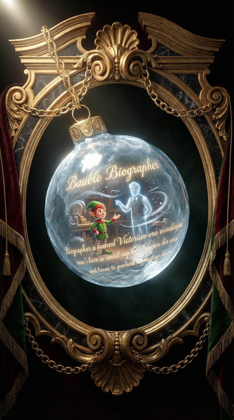 This ornament appears as a perfectly spherical bauble of crystal-clear ice, suspended by a golden chain-link cord. Biographical text flows across its surface like aurora borealis, while within its depths, tiny three-dimensional scenes show the evolution of each holiday character—an elf's progression from shy newcomer to confident thrower, a ghost's journey from haunting to helping, a conductor's transformation from strict timekeeper to joyful guide. An icicle quill hovers perpetually beside it, writing new chapters in frozen light that crystallize into permanent record, and the bauble emits a soft, musical jingle whenever a character's story arc advances to its next chapter.