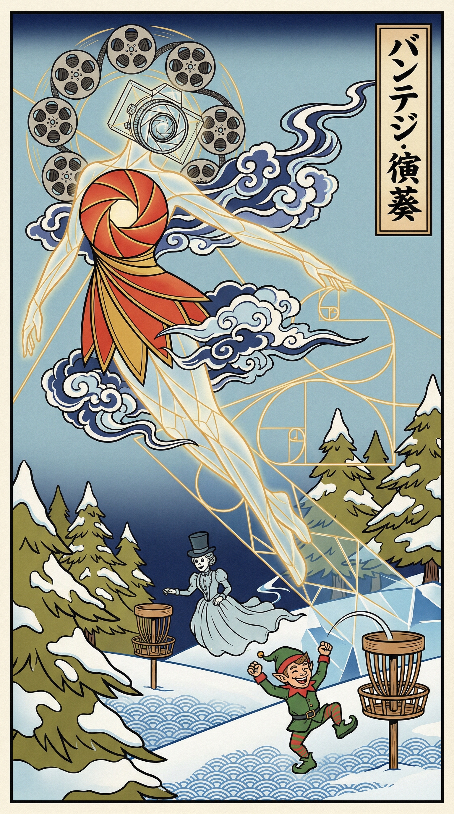 The Vantage Virtuoso manifests as a figure constructed entirely from intersecting sight lines and focal planes, its form constantly shifting between low-angle heroism and high-angle vulnerability. A crystalline viewfinder lens rotates where its head should be, clicking through infinite perspectives while a film-reel halo spins calculations of depth and composition. Golden ratio spirals trail from its movements, marking the mathematically perfect viewpoints it discovers for each frozen tableau.