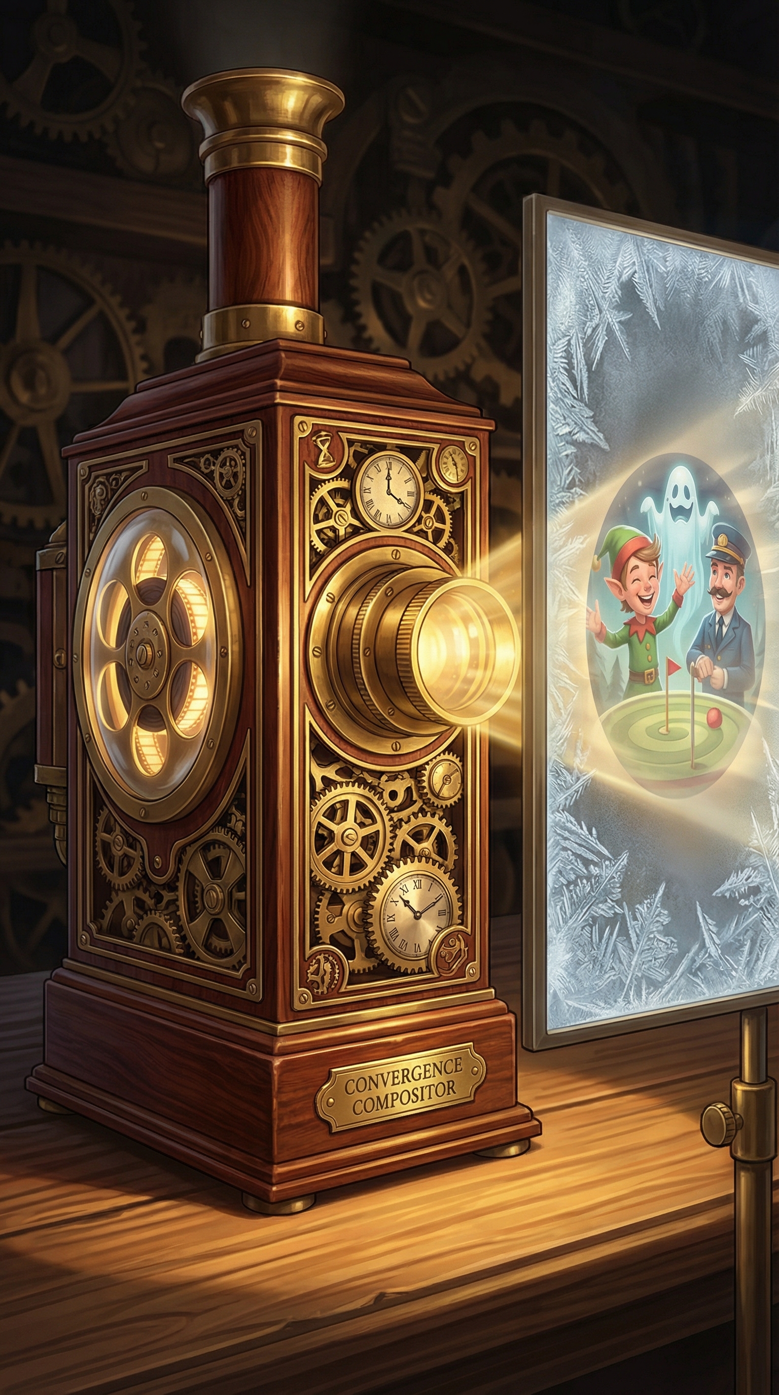The Convergence Compositor manifests as a mystical film projector with a heart of spinning reels, each containing the complete visual library of a different Christmas story archetype. Its frost-etched aperture opens only when characters from multiple tales align in perfect narrative synchronicity, capturing that precise frame. Through its multi-lens projection system, it overlays character plates—an elf's joyful throw, a ghost's mysterious float, a conductor's watchful stance—into single, richly layered compositions. The edges of each projected frame crystallize with ice, permanently bonding the convergence into the physical surface of a bag tag.