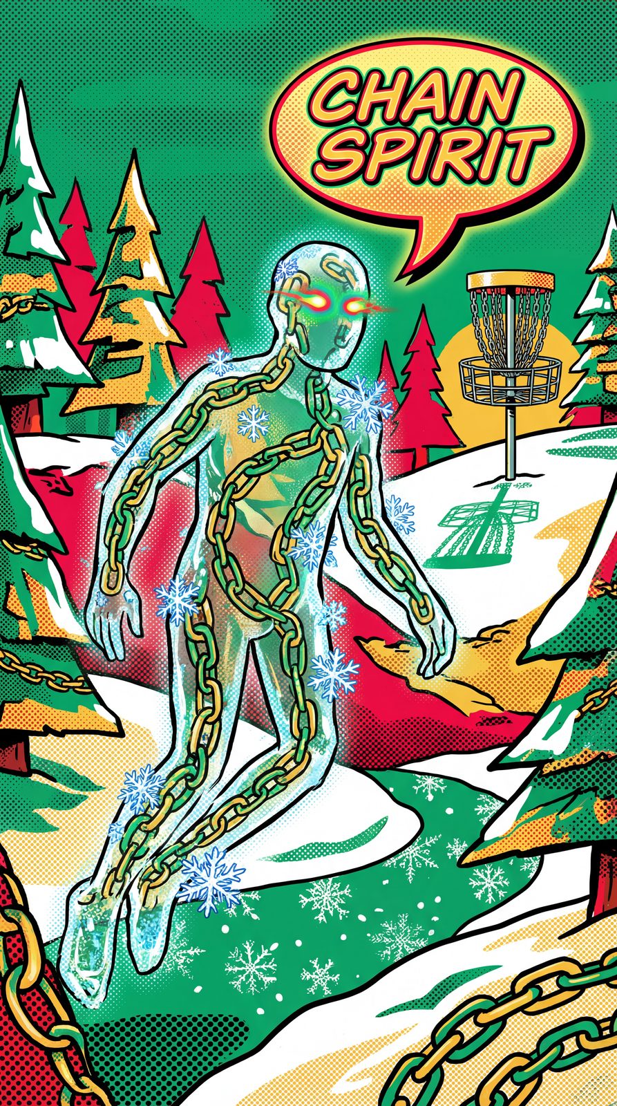 Born from the first ring of chains on a snowy Christmas Eve, the Chain Spirit emerged to bless disc golf with holiday magic, weaving together the brotherhood's journeys through ethereal guidance.