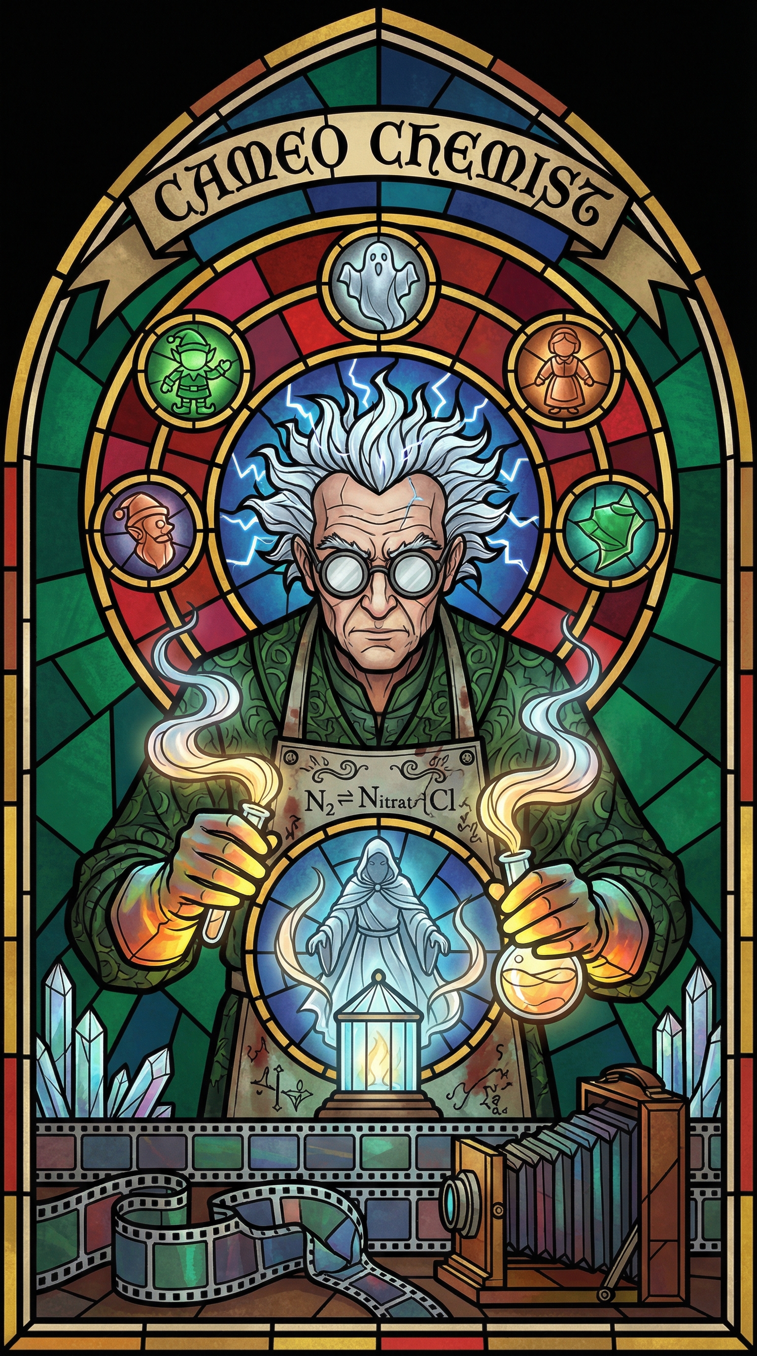 The Cameo Chemist crystallized in the moment when Scrooge's transformation tears mixed with George Bailey's bridge snow, creating a sentient photochemical reaction that could capture and preserve the exact emotional chemistry between any holiday characters across time and narrative. This spontaneous genesis occurred in the darkroom where all ten Christmas film reels were being developed simultaneously, their emulsions mingling to birth an entity capable of formulating infinite character combinations.