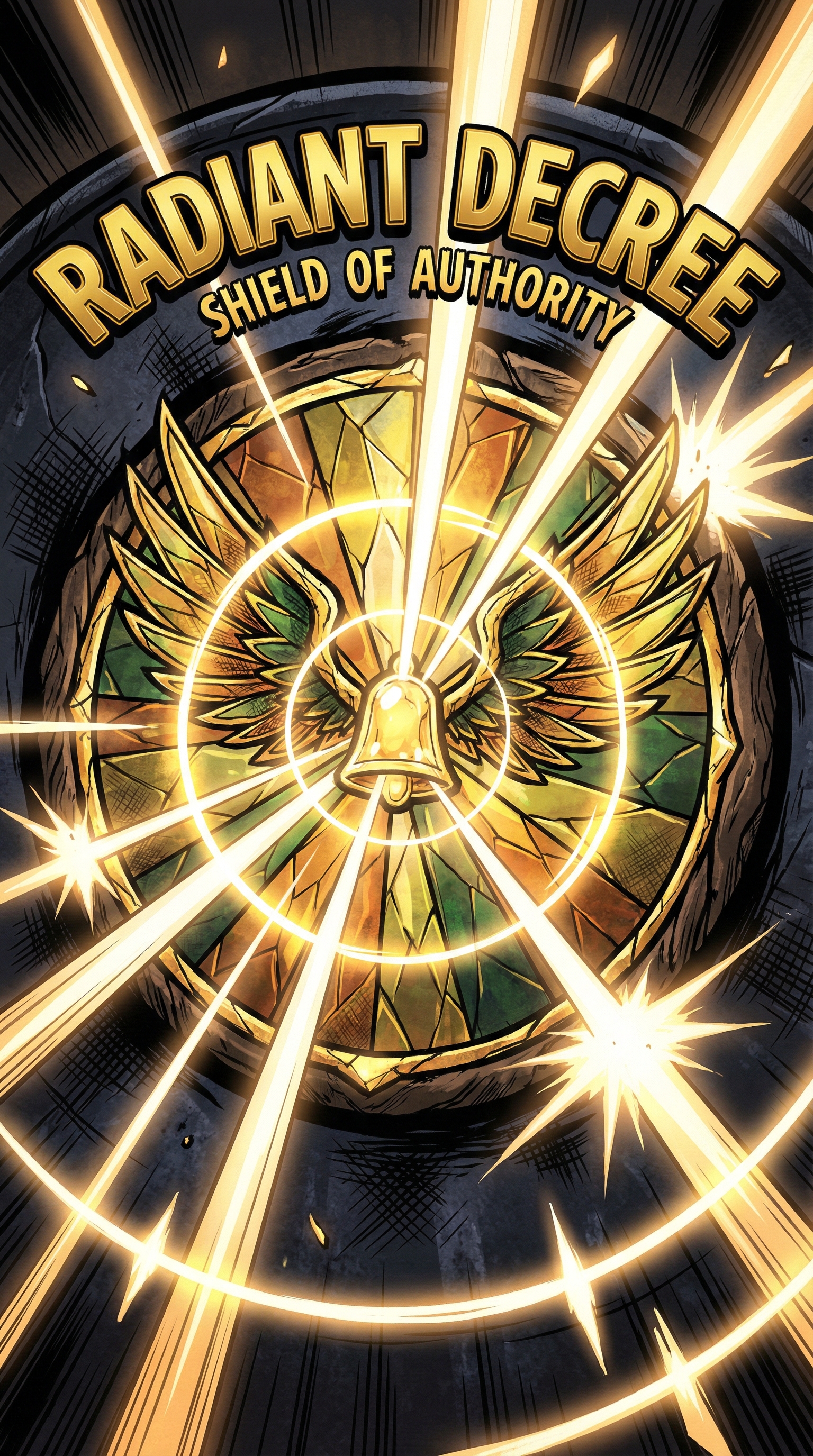 The Radiant Decree manifests as a luminous seal bearing the imagery of stained glass wings caught mid-flight, golden bell chimes frozen in eternal resonance within its center. Light seems to emanate from its edges regardless of environmental darkness, a property that has led many to believe it contains captured dawn itself. The seal maintains perfect clarity under any condition, never fogging or dimming, as if its radiance is independent of external forces.