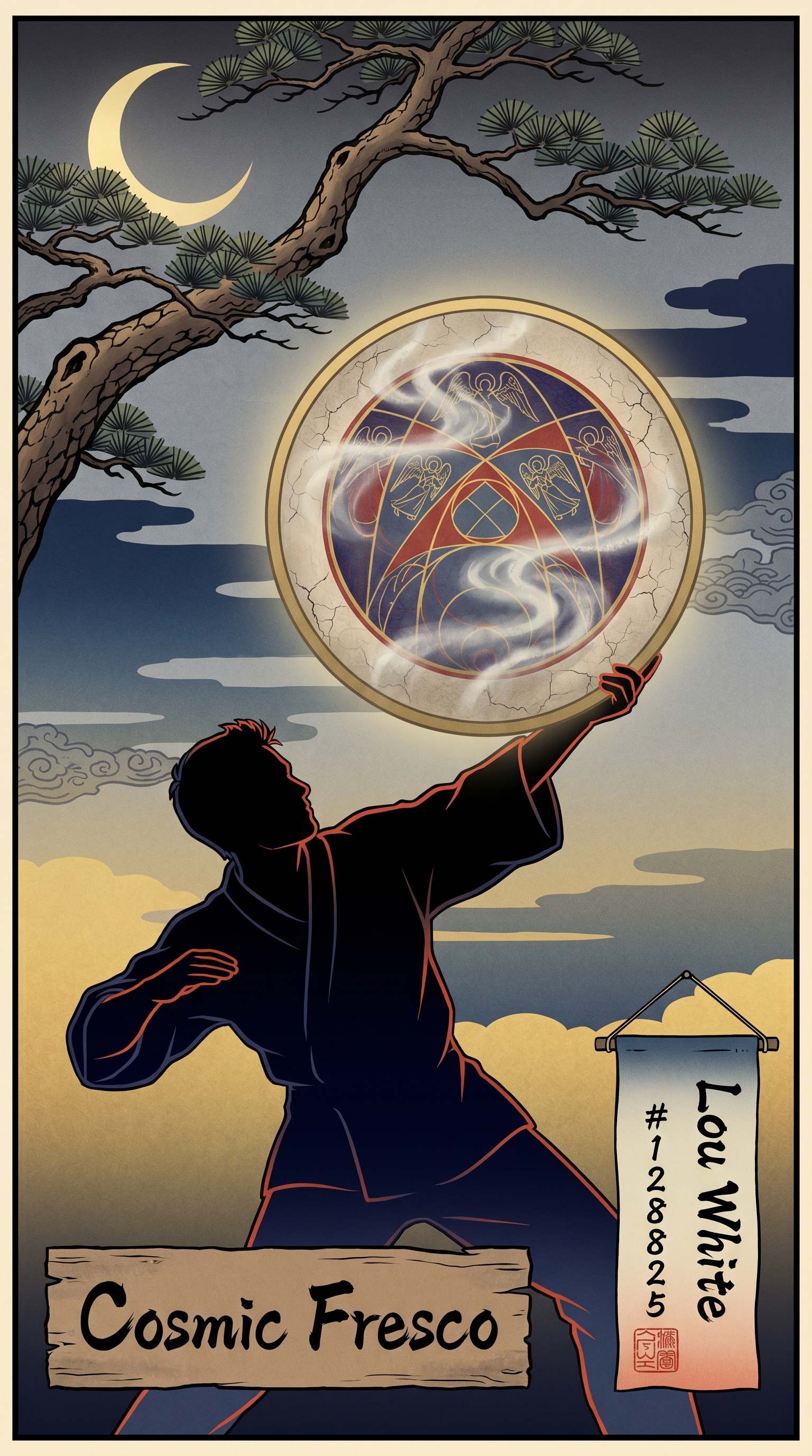 The Cosmic Fresco was forged in the moment when the Grays first witnessed disc golf on Johnny's hallowed grounds. Recognizing the geometric beauty of the sport - the perfect arcs, the triangular stability of stances, the chiaroscuro contrast of light and shadow across the course - they compressed this observation into a physical artifact: a disc that contains within it the captured beauty of every perfect throw ever made.