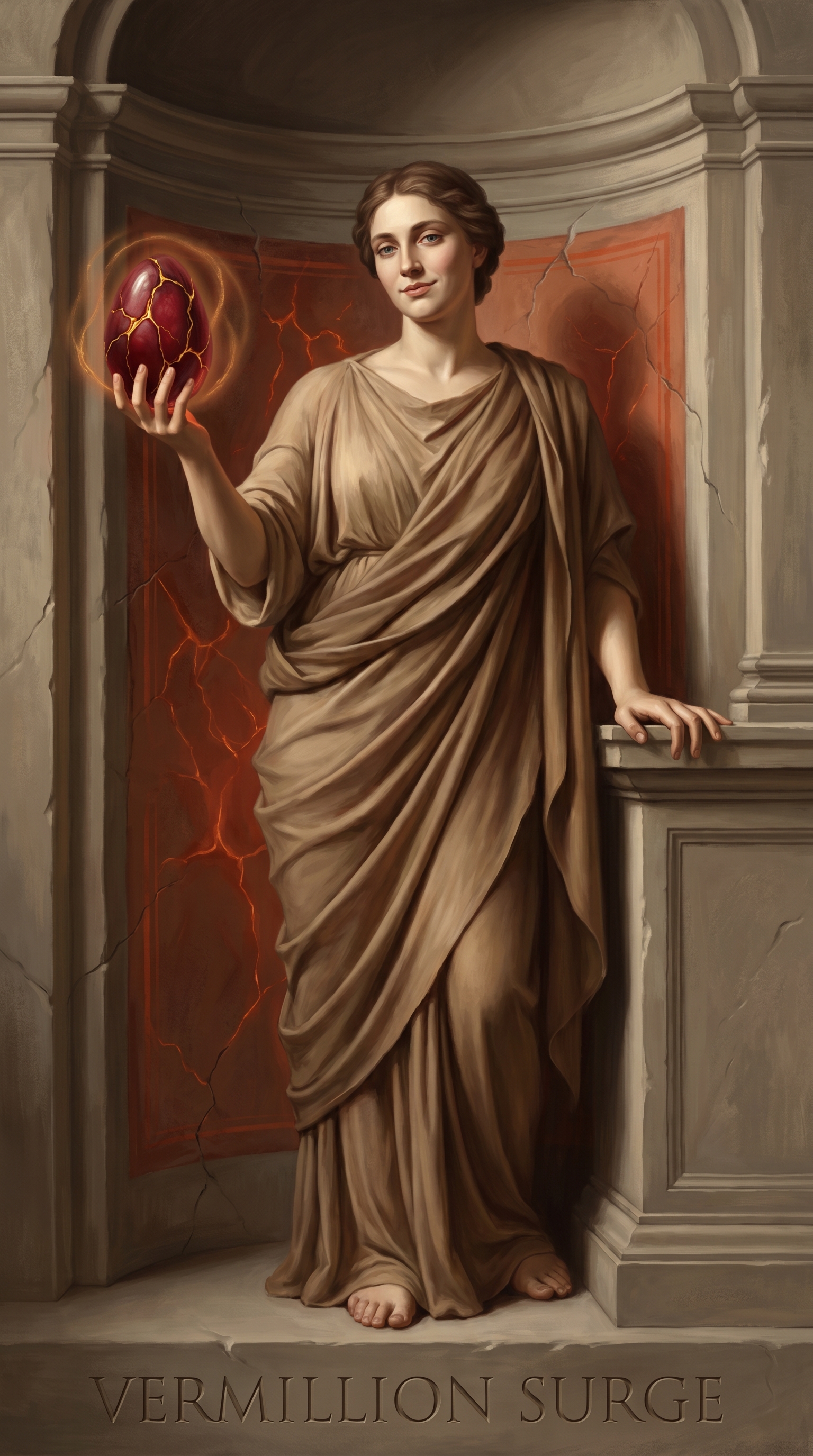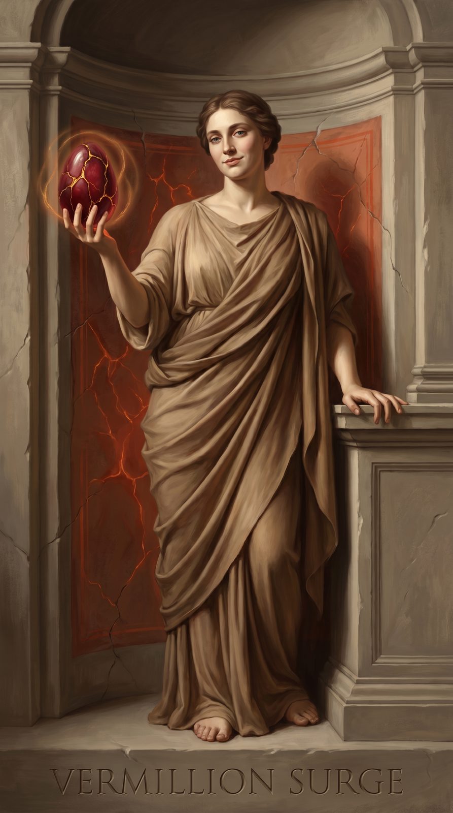 Born from the moment when the Grays observed Da Vinci's vermillion underdrawings glowing through fresco plaster—ancient chroma made manifest through alien perception. The surge represents that threshold where preparation becomes proclamation.