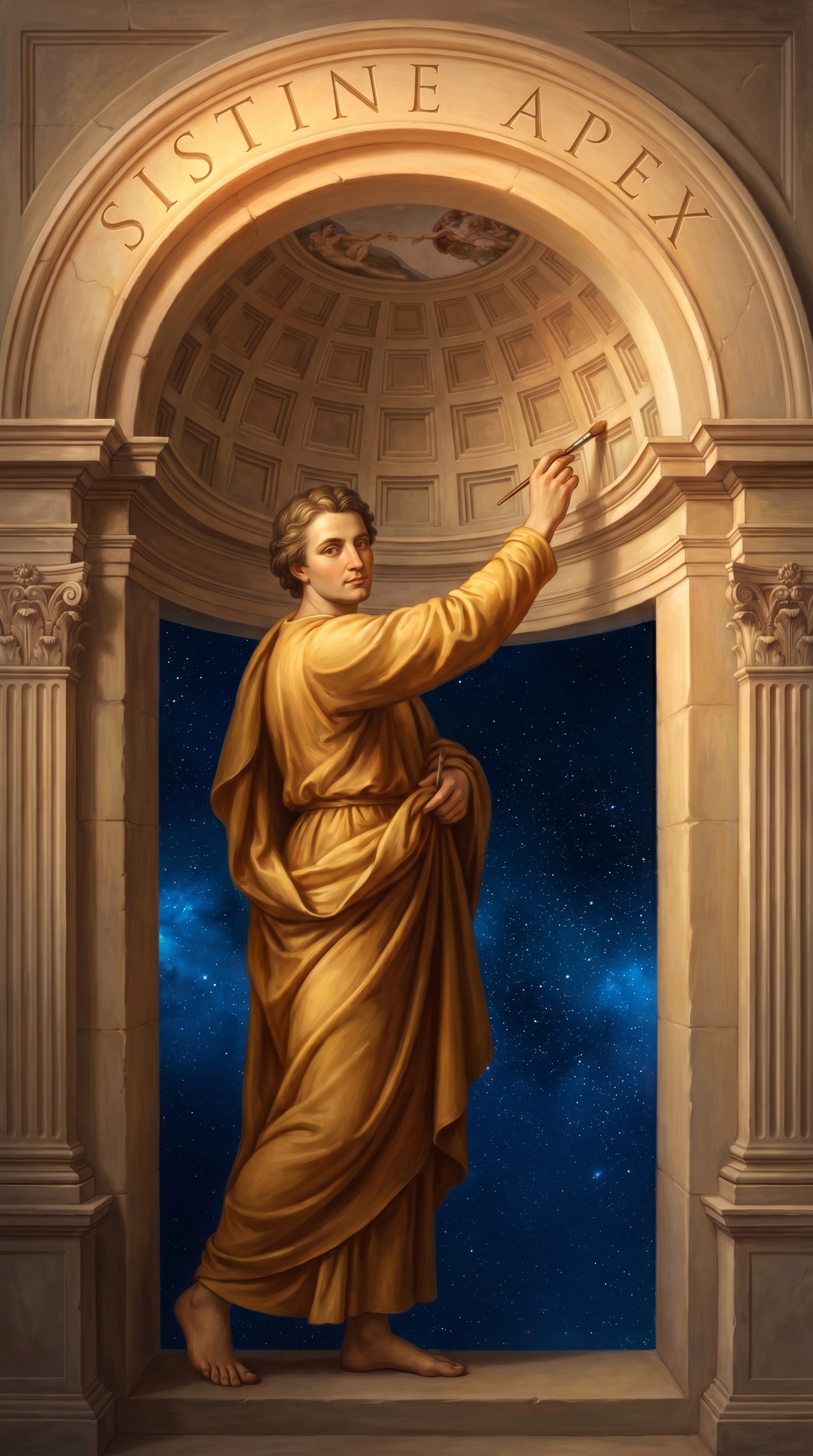 The apex itself radiates with golden chiaroscuro, the deep blues of cosmic space contrasting with bursts of divine light. Those who bear this name feel the weight of centuries of artistic tradition, the ghost of every master who ever straining reach for the infinite. The entity seems to exist in permanent twilight, caught between shadow and illumination.