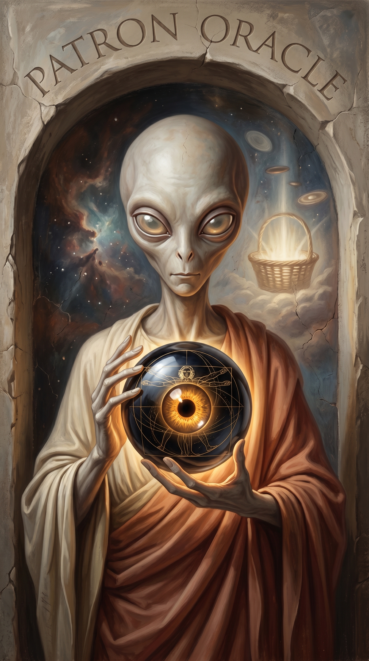 The Patron Oracle manifests as a palm-sized obsidian sphere with a golden iris at its center, perpetually rotating in the cosmic observer's grasp. The surface is etched with fine lines resembling both Da Vinci anatomical sketches and PDGA rule notation. It vibrates at frequencies that detect competitive worthiness and pulses with warm golden light whenever a bag tag transfer occurs, reflecting the current chromatic state of the eternal masterpiece.