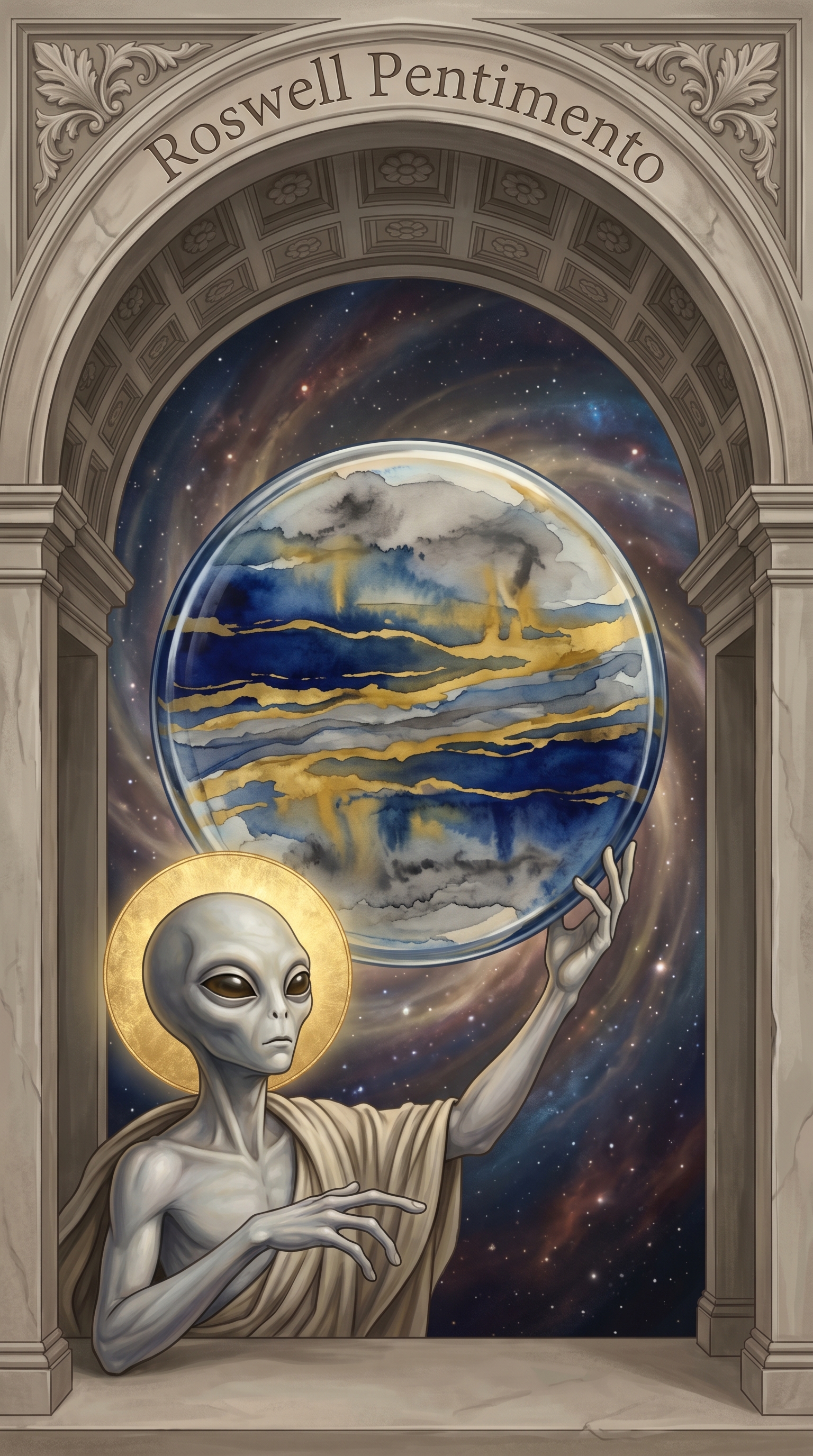 The Roswell Pentimento was created when the Grays first observed humanity's geometric games and decided to paint their observations across the cosmos. They discovered that each bag tag transfer didn't erase previous performances but instead created visible layers - like paint applied over wet plaster - where every prior holder's geometric worthiness remains visible beneath the current layer, forming a complete historical palimpsest.